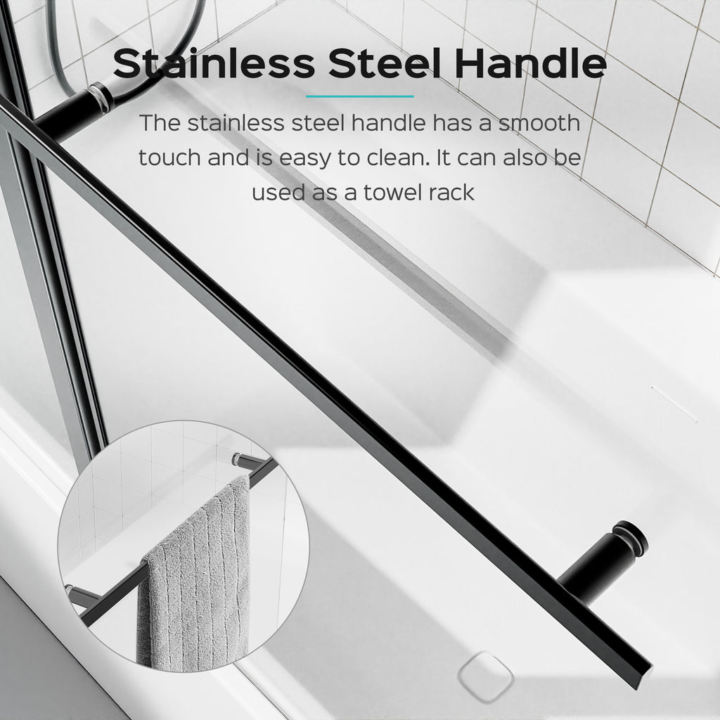 - BATHTUB SHOWER DOOR DESIGN: 43 inch in width * 58 inch in height bathtub shower door panel, matte black finish design. The shower door comes with a sturdy metals profile to fix against the wall which creates a barrier and prevents water from leaking and floor getting wet. The design is simple and practical, does not occupy too much position, and improves the space utilization rate of the bathroom.