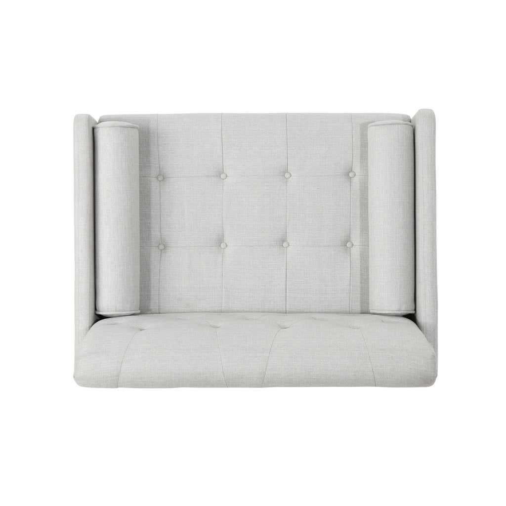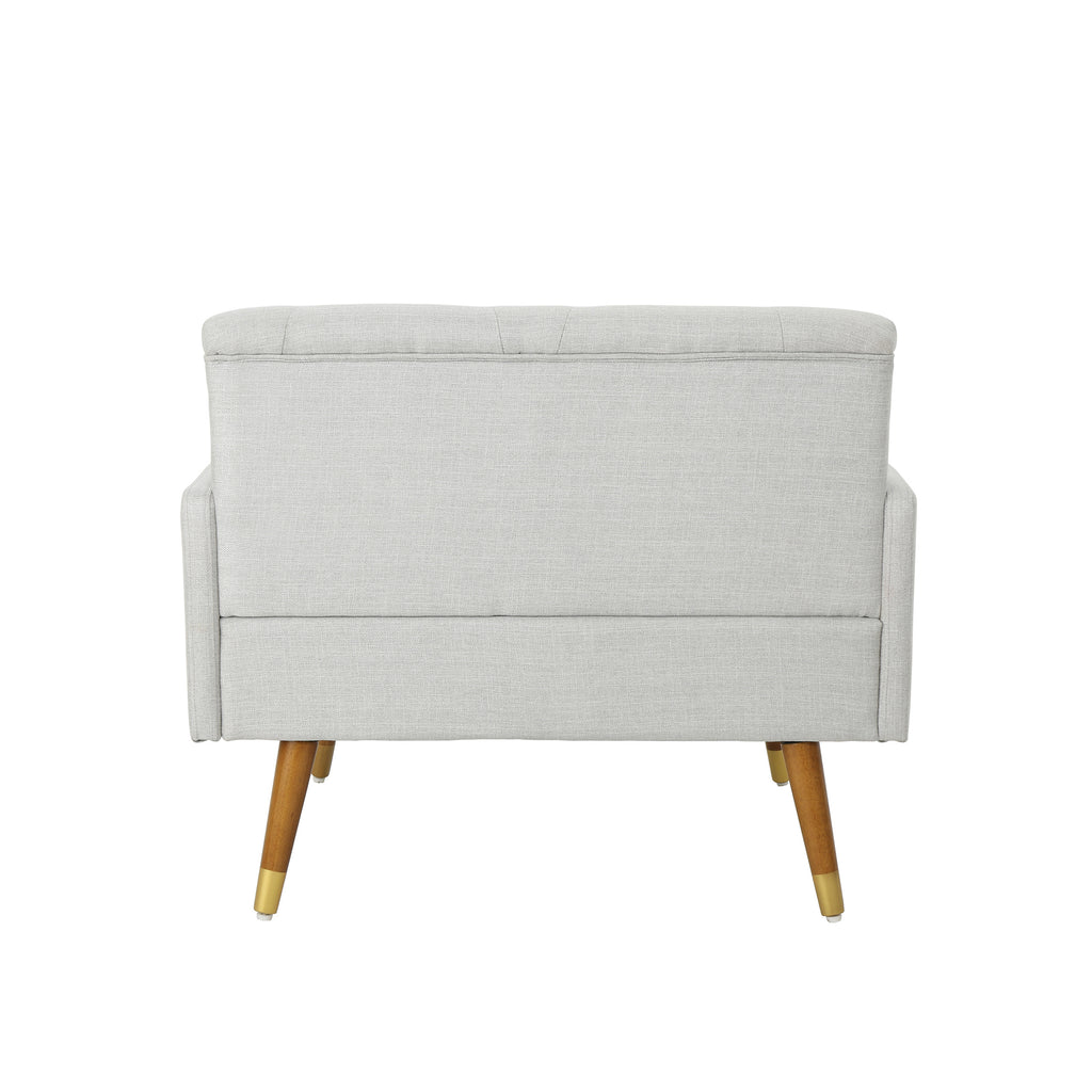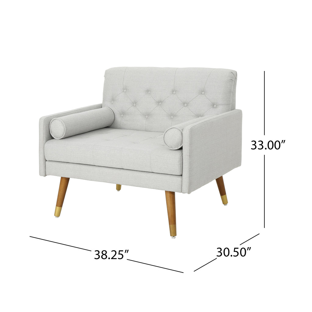 - Emulating the characteristic style of interior design in the 1950s, this piece will bring your home to life with its plush and inviting presence. The dramatic silhouette, wood-finish frame, and tapered, splayed, gold-tipped legs give your space all the unique and statement-making charm it deserves, whether you gravitate toward a retro mid-century modern aesthetic. Smooth upholstery makes a sophisticated statement, while button-tufted stitching and two bolster pillows complete the look.