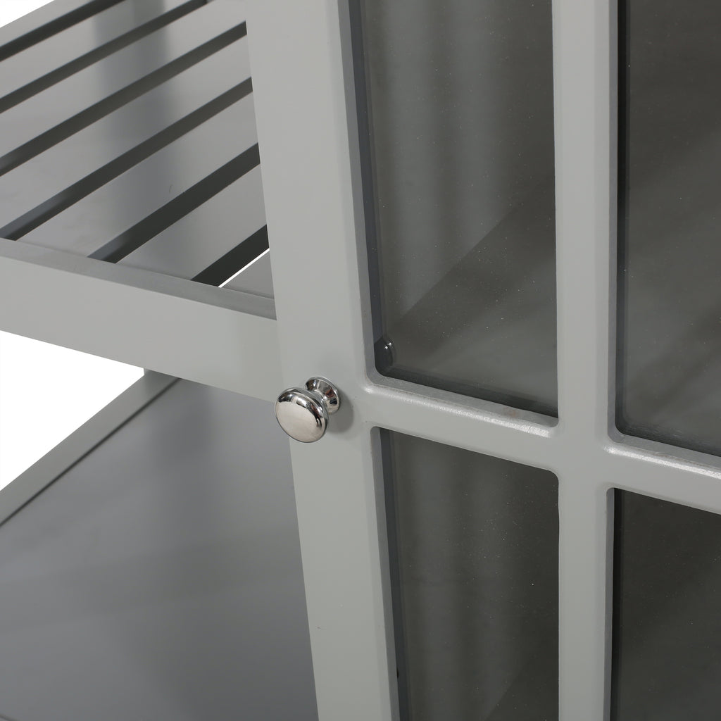 - MULTI-FUNCTIONAL: Our kitchen cart offers two drawers, one glass-paneled cabinet space, and two half shelves for storing your items. This cart is also finished with a towel holder on one side and hanging hooks on the other. The bottom of the cart is completed by rolling casters with locks that make it effortless to transport.
