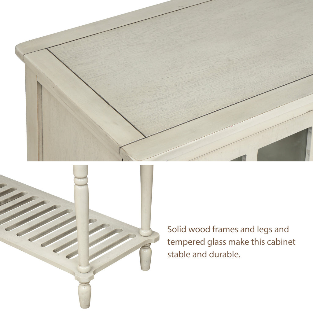 - Solid wood frames and legs and tempered glass make this cabinet stable and durable.