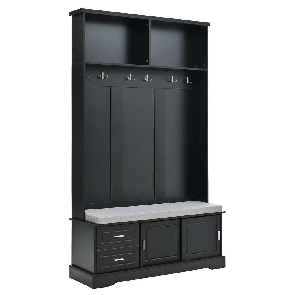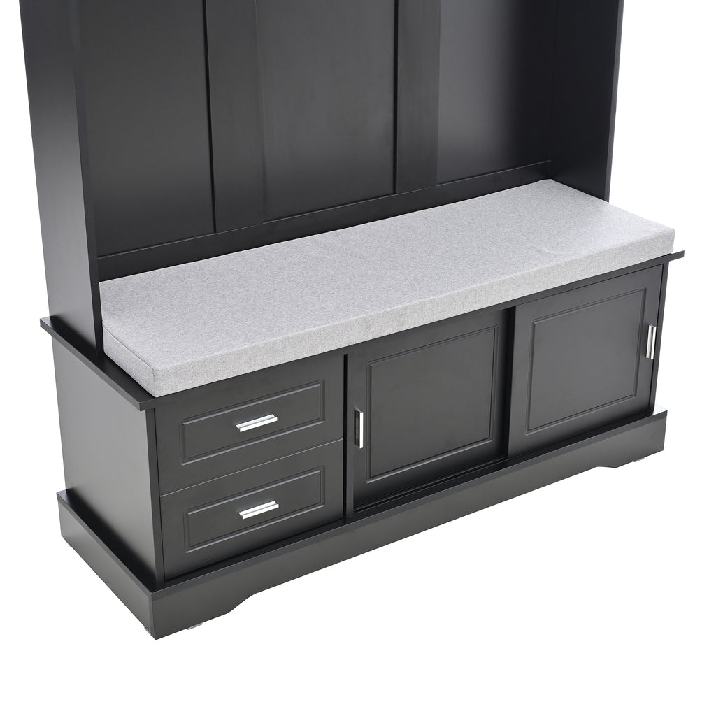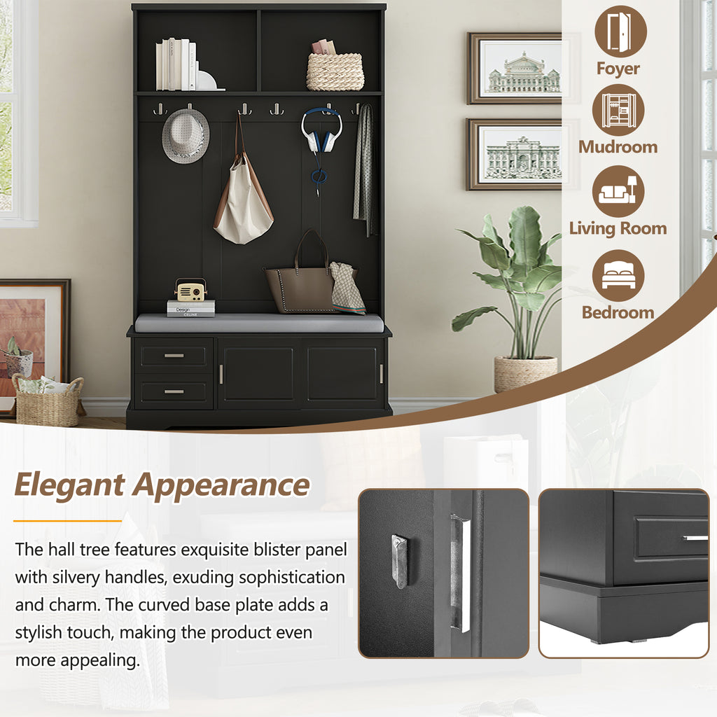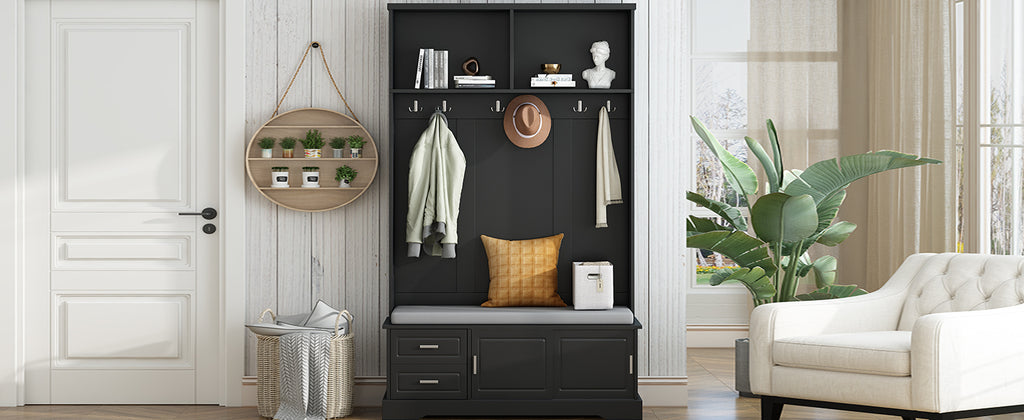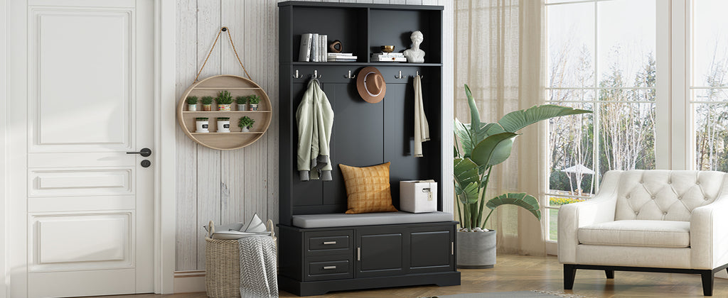 - This hall tree features a generously padded bench that offers a cozy spot to sit while putting on or taking off your shoes. The detachable gray cushion not only facilitates easy cleaning but also ensures a soft and comfortable experience to either begin or end your day.