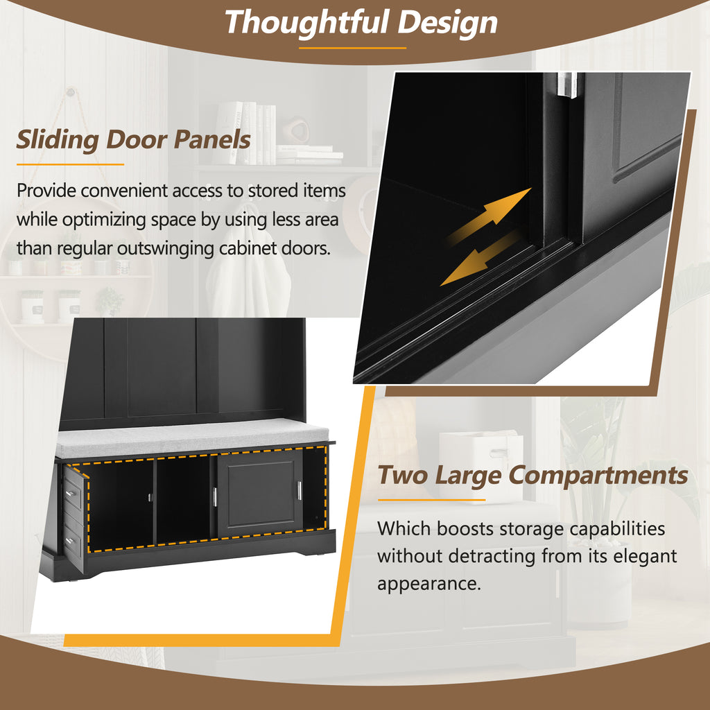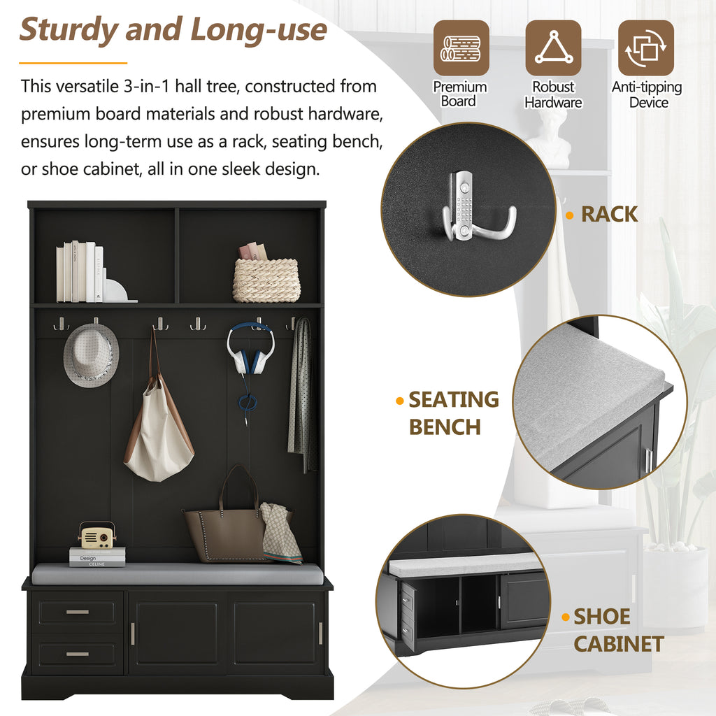 - This versatile 3-in-1 hall tree, constructed from premium board materials and robust hardware, ensures long-term use as a rack, seating bench, or shoe cabinet, all in one sleek design. Furthermore, we offer anti-tipping device to help reduce the risk of tip-over accidents, you can anchor the cabinet to the wall optionally.