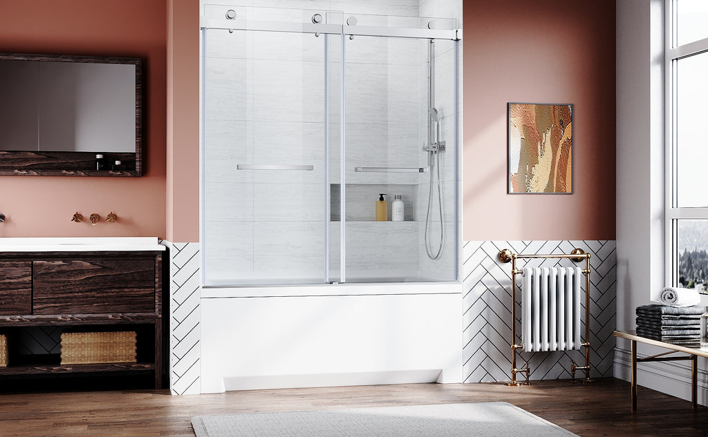 - Convenience Design:56-60' ×62',frameless bypass tub glass doors allows you to access your tub using both left and right doors,100% stainless steel hardwares in Brushed Nickel,reversible installation.ATTENTION:Requires minimum threshold depth of 3 3/8 in.