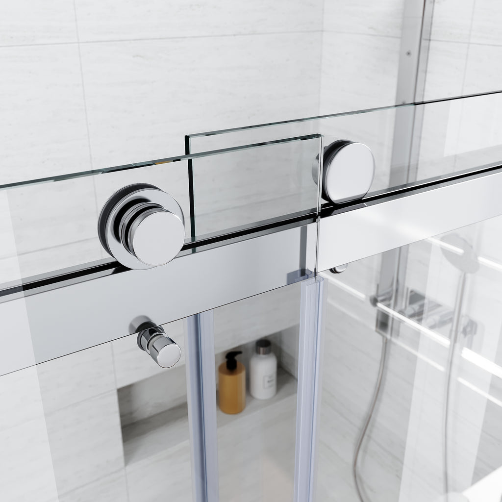- About Door Adustment:Can be trimmed up to 4 in. for width adjustment(56-60In) by cutting the stainless steel top guide bar and bottom anti-splash threshold.For out-of-plumb (uneven) walls,this model features round sliding roller disks with 3/8 inch built-in adjustability.