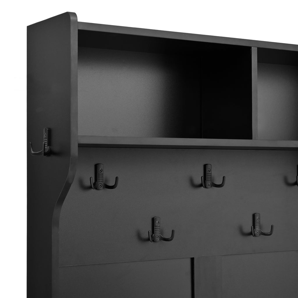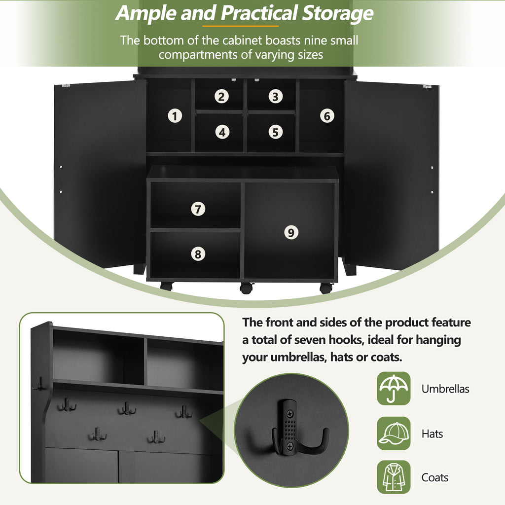 - The bottom of the cabinet boasts nine small compartments of varying sizes, effortlessly accommodating shoes or clutters of different dimensions. The front and sides of the product feature a total of seven hooks, ideal for hanging your umbrellas, hats or coats. It offers versatile storage options for your belongings, presenting you with a tidy entryway.