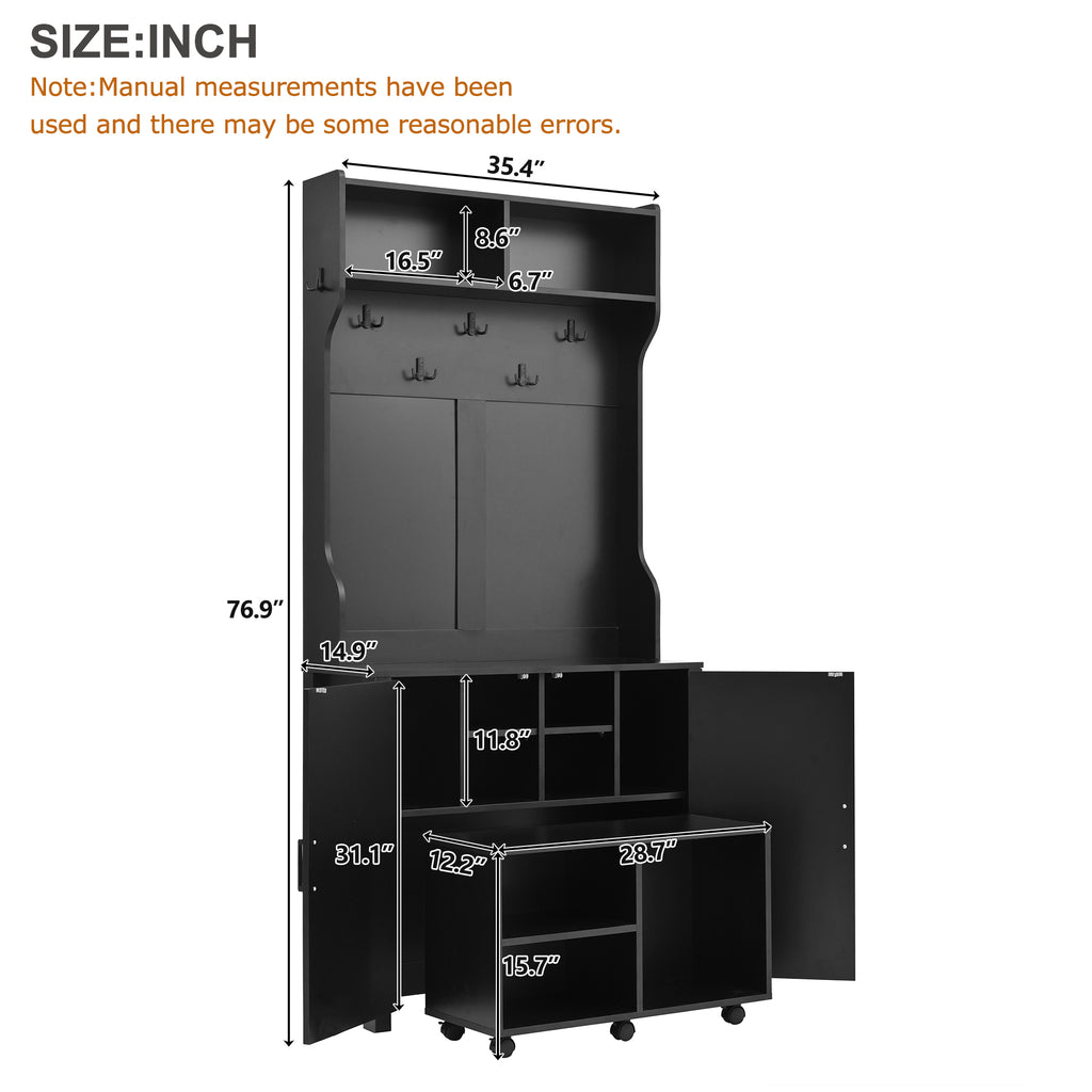 - Integrating coat rack, shoe cabinet, hanging hooks and seating bench, this hall tree offers a complete organization system for your entryway or hallway. No matter where it is placed, with this all-in-one furniture piece, you can meet a variety of storage needs in one compact design.