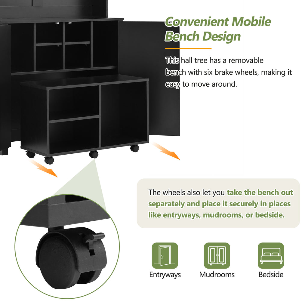 - This hall tree has a removable bench with six brake wheels, making it easy to move around. The wheels also let you take the bench out separately and place it securely in places like entryways, mudrooms, or bedside. Thereby you can get multiple uses from just one product according to your personal need.
