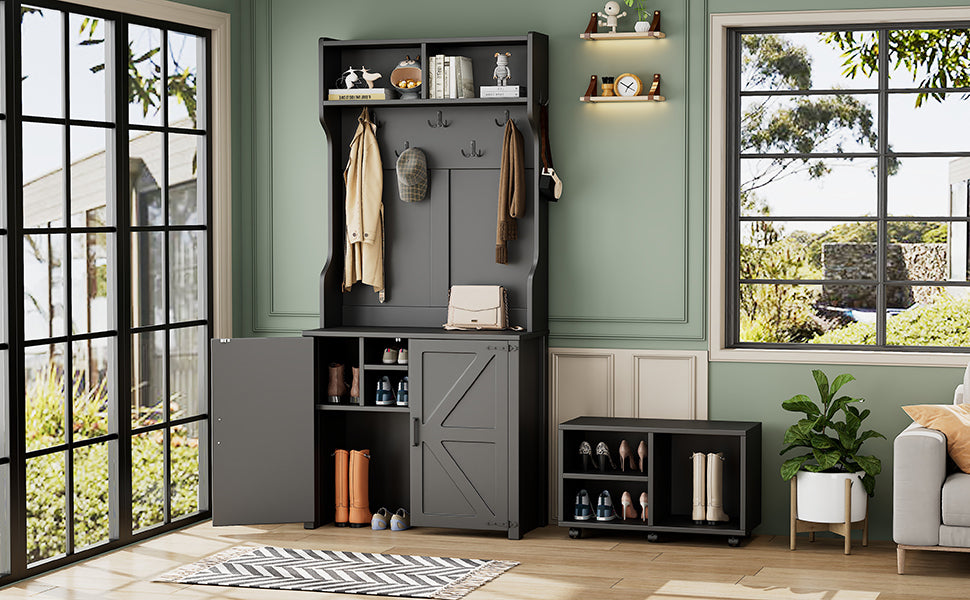 - Adorned with classic retro black handles, hinges and hooks, this hall tree exudes a rustic charm. The gracefully curved boards and two delicate barn doors further elevate the aesthetic of your hall tree, making it suitable to any farmhouse-inspired decor in your home.
