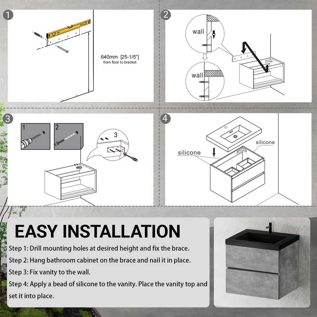 - Easy to Install: The open back design allows for easy plumbing. All components are pre-drilled for quick assembly in less than 30 minutes. Experience convenience and sophistication in your bathroom with this stylish and functional vanity solution.