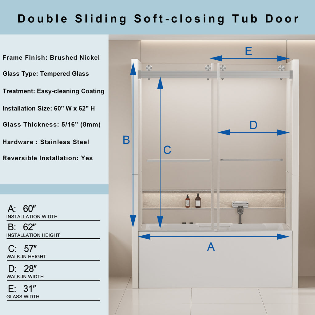 - 5/16' Tempered Glass: ANSI-certified clear tempered glass with polished edges offers exceptional durability and safety, resisting damage from soap and lime scale while maintaining a glossy, pristine appearance over time.