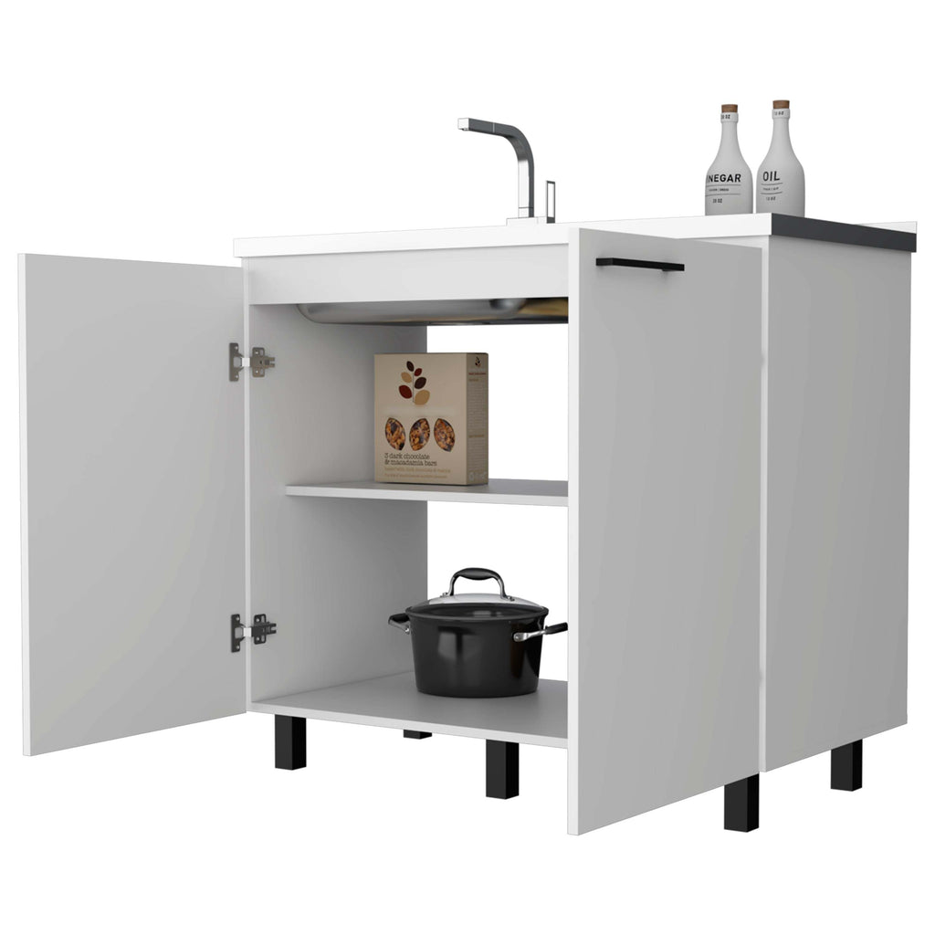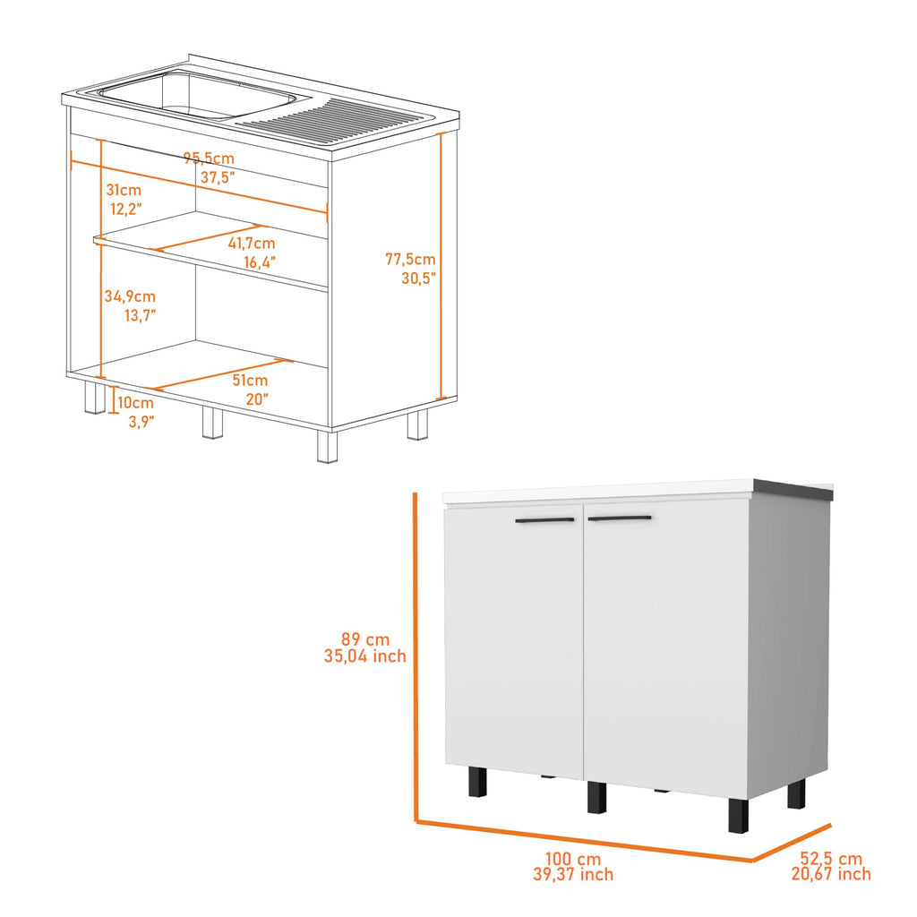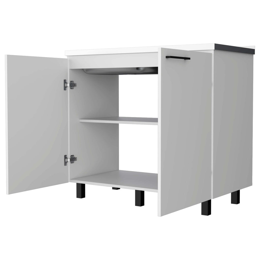 Built to last with a durable heavy-duty aluminum countertop, this cabinet features stylish slender legs, two large doors, and internal shelving, providing both functionality and elegance to any kitchen space. Whether you're renovating your kitchen or in need of additional storage, the 2 utility sink and cabinets offers the perfect combination of durability, style, and practicality, all wrapped in an elegant white manufactured wood finish.