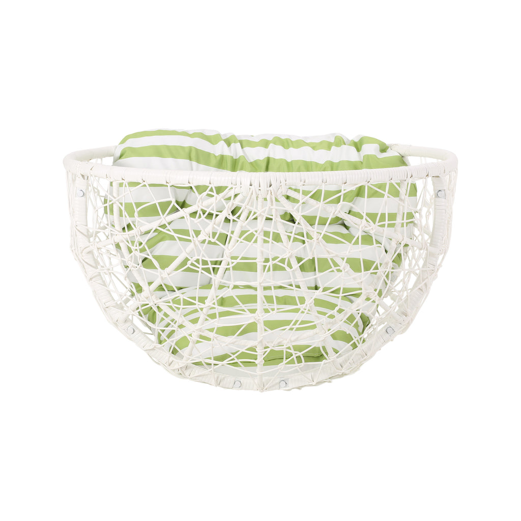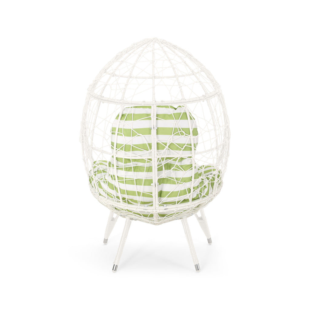 Unique style and cozy construction make this chic chair an ideal way to complete your backyard oasis. The teardrop-shaped chair features an iron frame woven with faux rattan, the abstract mesh design creating an open basket look. The seat is topped with plush, water-resistant cushions that add extra comfort to this chic chair.