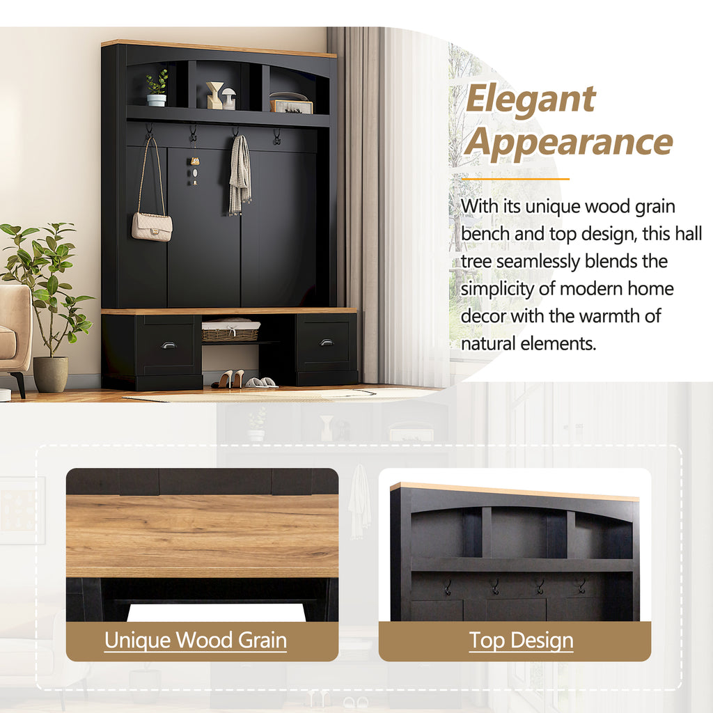 - With its unique wood grain bench and top design, this hall tree seamlessly blends the simplicity of modern home decor with the warmth of natural elements. The wood colors also exhibit an understated yet elegant texture, enhancing the classiness of the entrance area.