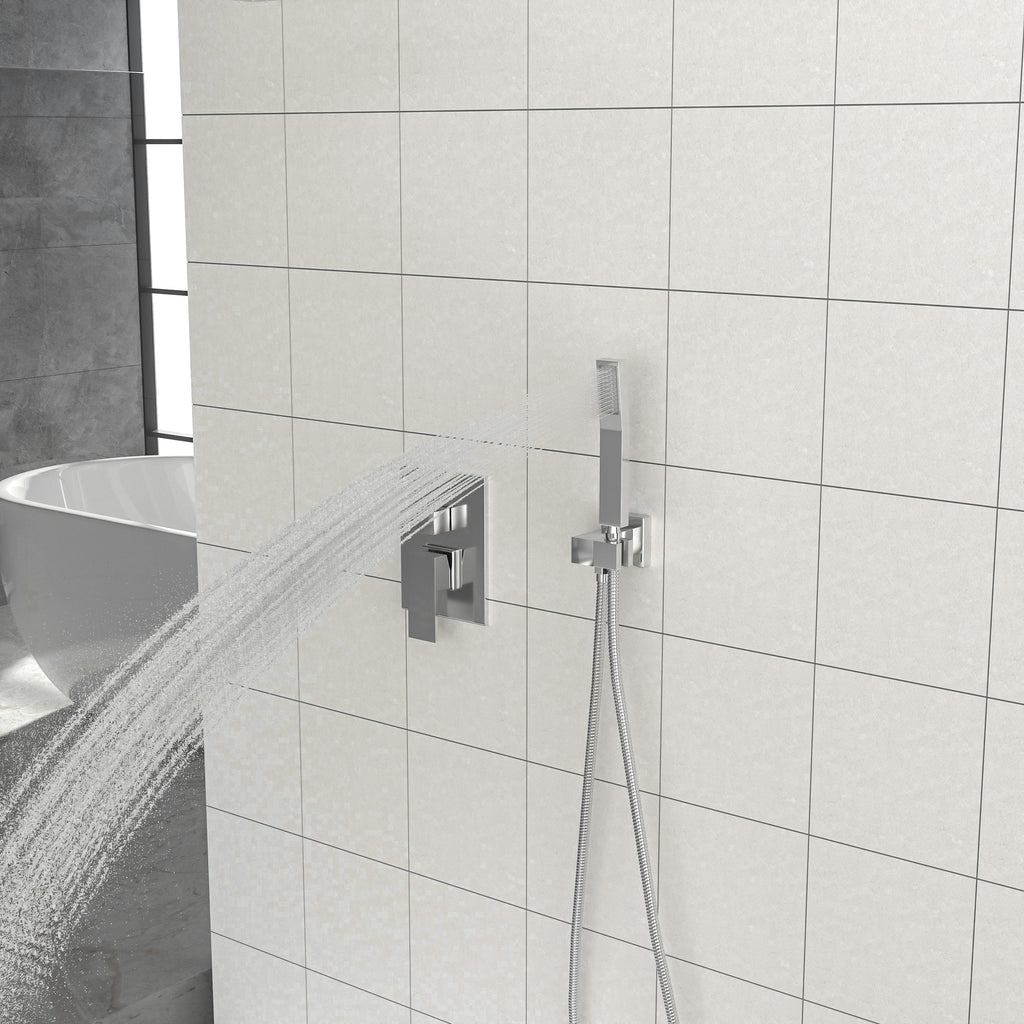 1. Product type: Dual shower head shower set 2. Mounting / Installation Type: Ceiling Mount 3. Adjustable water flow: Yes 4. Max Flow Rate (GPM): 1.8 5. Primary Material: stainless steel, brass 6. Finish: Chrome 7. Spray Pattern: Rain 8. Swivel: Yes 9. Shower Head Shape: Square 10. Hand Shower Included: Yes 11. Shower Arm Included: Yes 12. Hose Included: Yes 13. Flange/Escutcheon Included: Yes 14. Diverter Required: Yes 15. Required Valve Type: Pressure Balanced 16. Rough-in Valve Included: Yes 17. Number of Spray Patterns: 1 18. Number of Shower Heads: 2 19. Handheld shower: ABS plastic material 20. Hose: 304 stainless steel