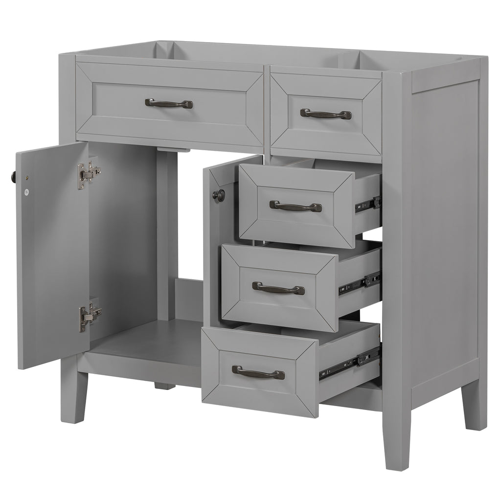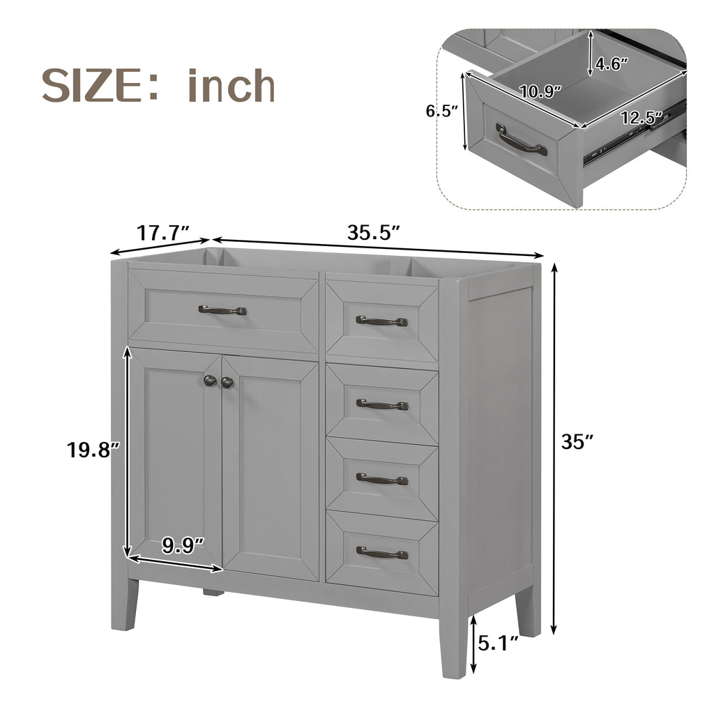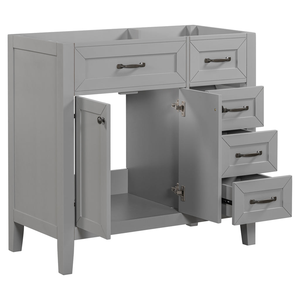 - Stylish 36' Bathroom Vanity Base Only: This 36' bathroom vanity is suitable for bathroom in any decoration style. Freestanding grey vanity cabinet with black handles complies with your bathroom facilities. The groove design on the door and drawer increases the artistry and aesthetics of the home environment. If you're looking for a simple but stylish bathroom sink vanity, our product will be a great choice to upgrade your bathroom.