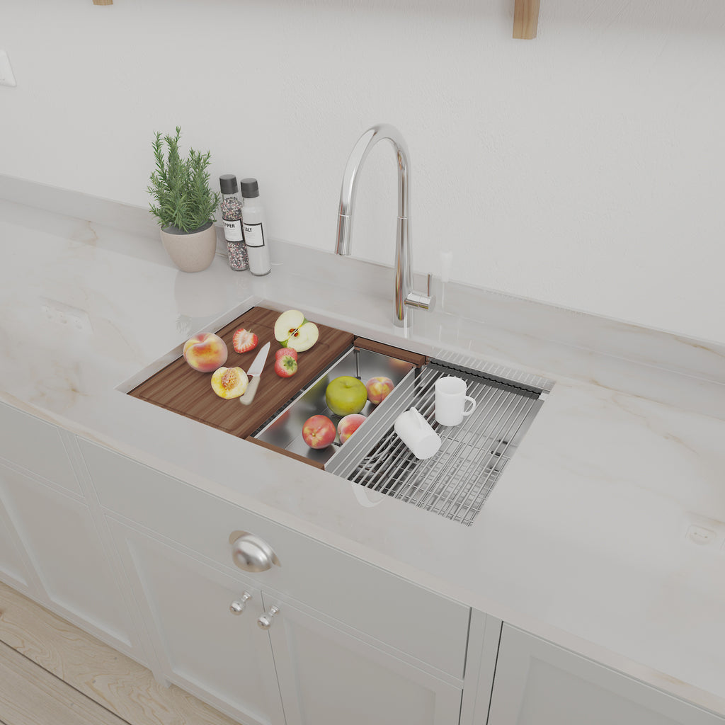 - Save Counter Space & Keep Cleaning: Stainless steel workstation sink with integrated ledge allows you to slide accessories accross the kitchen sink. The undermount kitchen sink is equipped with various accessories to help you washing, cutting and draining on the sink for meal prep easily and will not make counter dirty for saving your cleaning time.