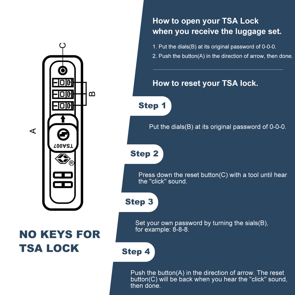 TSA lock allows only customs agents to inspect your luggage without damaging the lock and protects your stuffs in luggage and privacy more better. Simply set the combination. No keys are required.