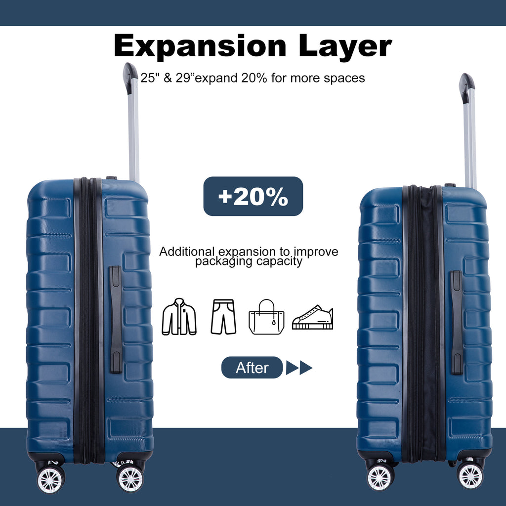 - 【5 Piece Suitcase Sets 】5 Piece sets includes 21' Carry On luggage, 25'/29' checked luggage, a travel duffel bag and a toiletry bag. 29' suitcases and duffel bag with expansion zipper that adds 25% more space.PC material makes the luggage more durable, lighter and impact-resistant.