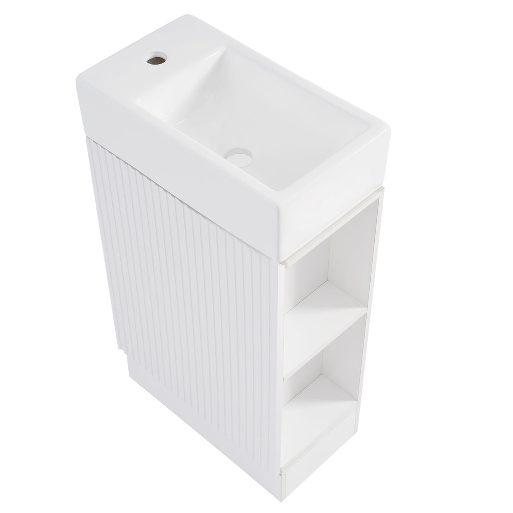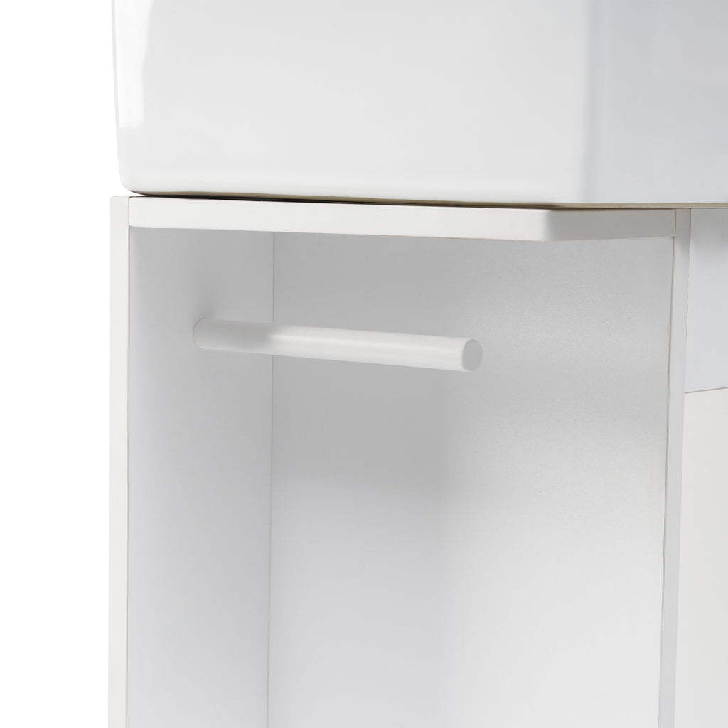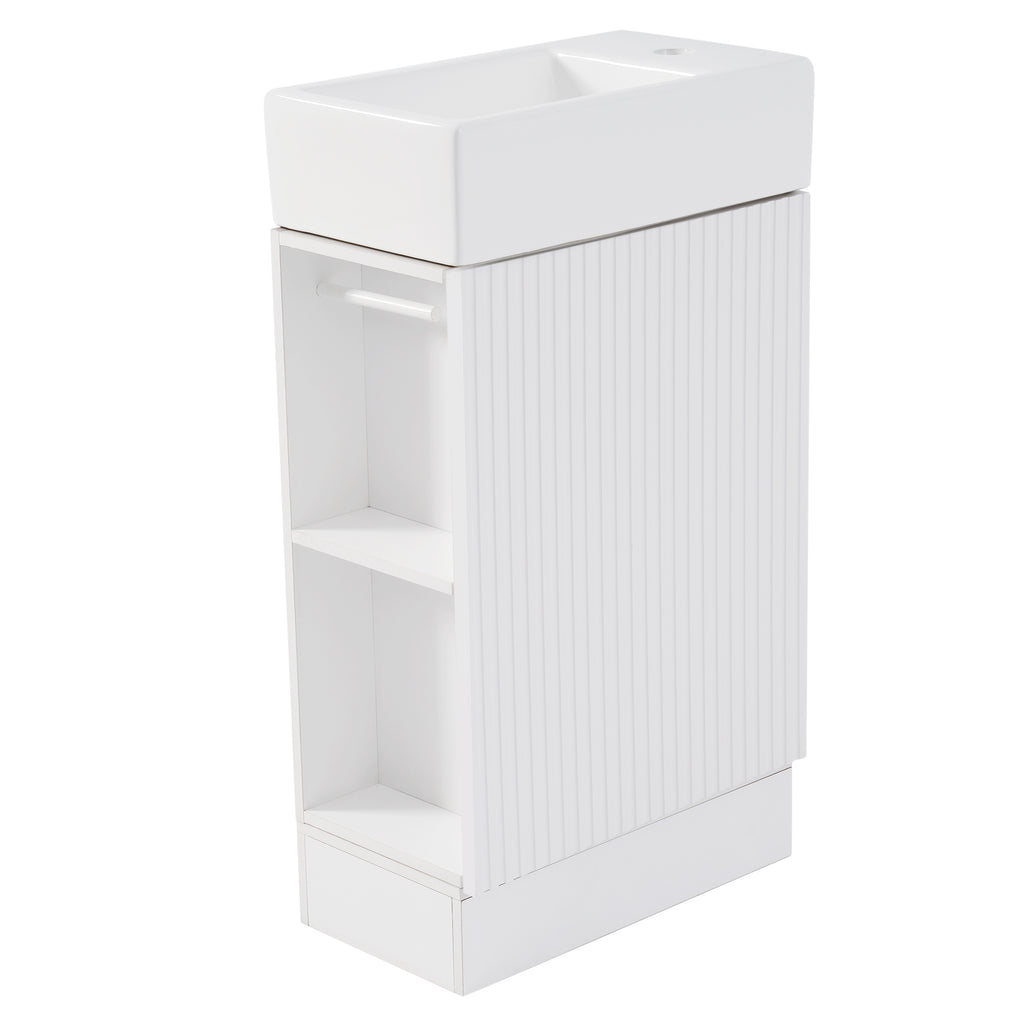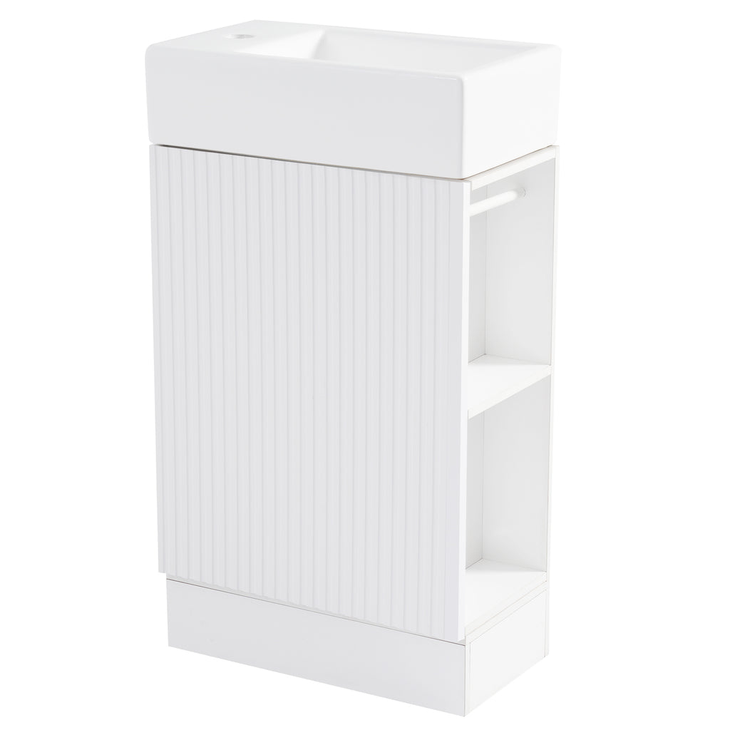 - Vanity with Cabinet & Toilet Paper Holder & Shelf - This bathroom vanity has different storage space: one cabinet with door, two-tier storage shelf on the side, and toilet paper holder. You can put soaps, towels, shampoos, tissue paper and other bathroom essentials in it.