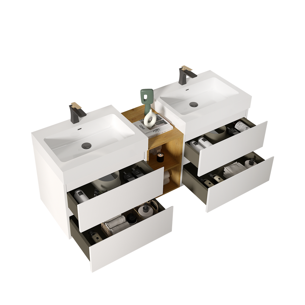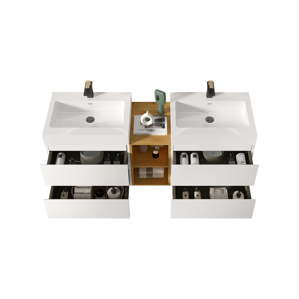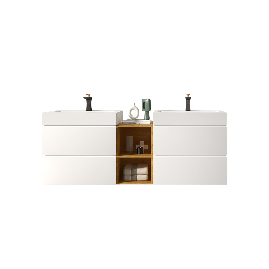 [Sleek handle-free design], [Open shelves included], [Durable one-piece basin]