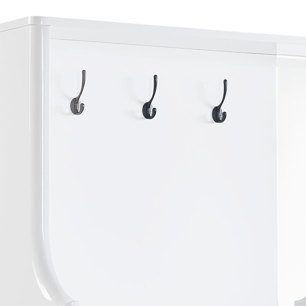 - 3 Hooks Included, Padded Seat Cushion, Mirror Included, High Gloss Finish•2 Door Storage w/2 Shelves