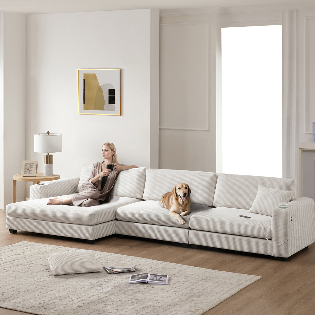 The extra wide seat and chaise lounge offers luxurious and comfortable seating options with convenient features such as cup holders and USB charging ports. The extra thick corduroy fabric adds to the overall comfort and beauty of the sofa. A great choice for living!