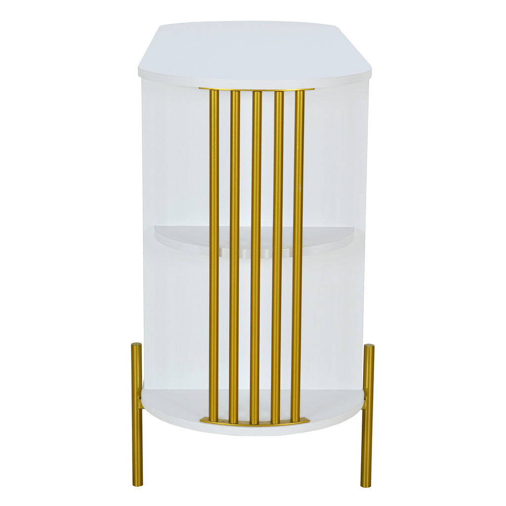 - Thoughtful Details: On both sides of the cabinet are particularly notable, there are elegantly curved open shelves that perfect for displaying smaller items or keeping everyday essentials within easy reach. The gold vertical bars that support the shelves add a touch of sophistication and reinforce the luxurious feel. The legs are equipped with foot pads to protect floors from scratches and provide stability. Curved shelves weight capacity: 47 lbs.