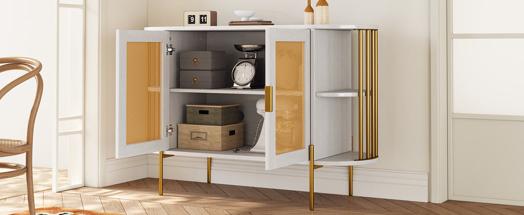 - High-Quality Material: Crafted from premium particleboard, It ensures sturdiness. The two doors feature finely crafted rattan, guaranteeing long-lasting use. The gold handles, legs, and side supports are all power coating, resulting in a smooth surface that not only adds a touch of luxury but also enhances durability and stability. The interior includes an adjustable shelf to meet storage need. Tabletop weight capacity: 331 lbs; Shelves weight capacity: 110 lbs.