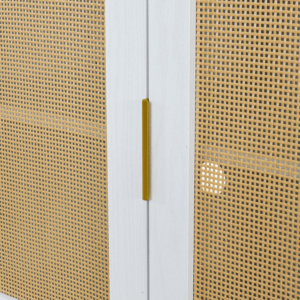 Crafted from premium particleboard, It ensures sturdiness. The two doors feature finely crafted rattan, guaranteeing long-lasting use. The gold handles, legs, and side supports are all power coating, resulting in a smooth surface that not only adds a touch of luxury but also enhances durability and stability. The gold vertical bars that support the shelves add a touch of sophistication and reinforce the luxurious feel.