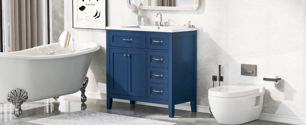 - Stylish 36' Bathroom Vanity: This 36' bathroom vanity is suitable for bathroom in any decoration style. Freestanding blue vanity cabinet with silver handles complies with your bathroom facilities. The groove design on the door and drawer increases the artistry and aesthetics of the home environment. If you're looking for a simple but stylish bathroom sink vanity, our product will be a great choice to upgrade your bathroom.
