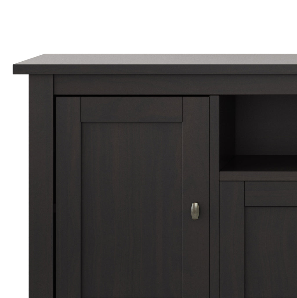 - Features central open area with one (1) drawer, one (1) compartment with flip down door, two (2) framed doors with enclosed spaces & two (2) large side storage cabinets open to one (1) adjustable shelf each
