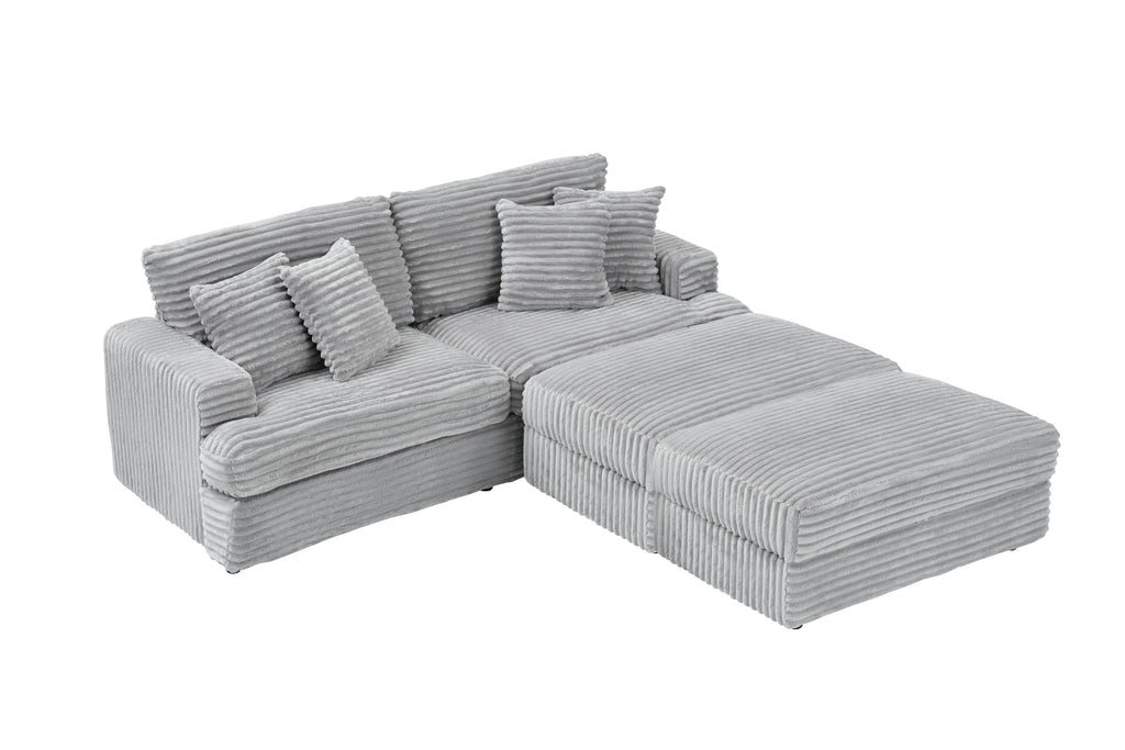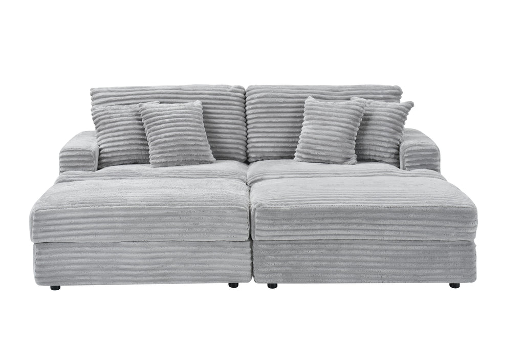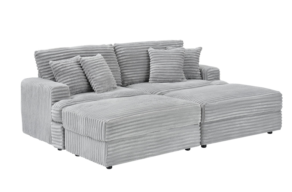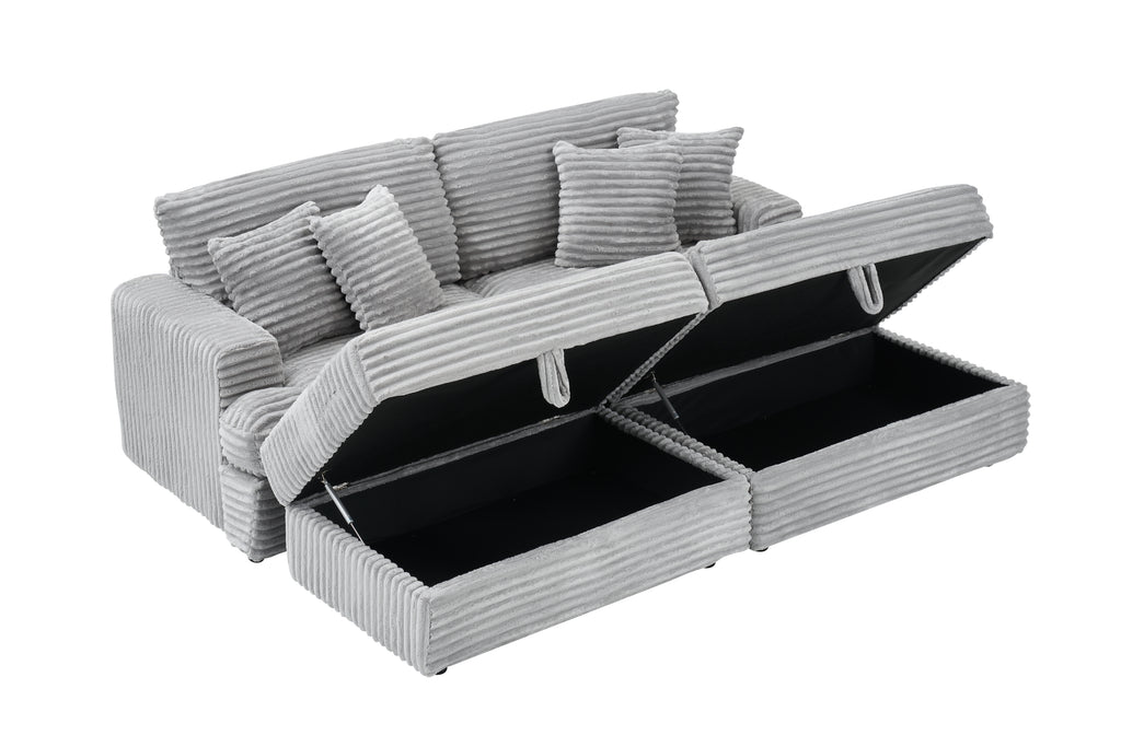 A grey corduroy double footstool sofa with 4 pillows that can be moved and has a storage function.