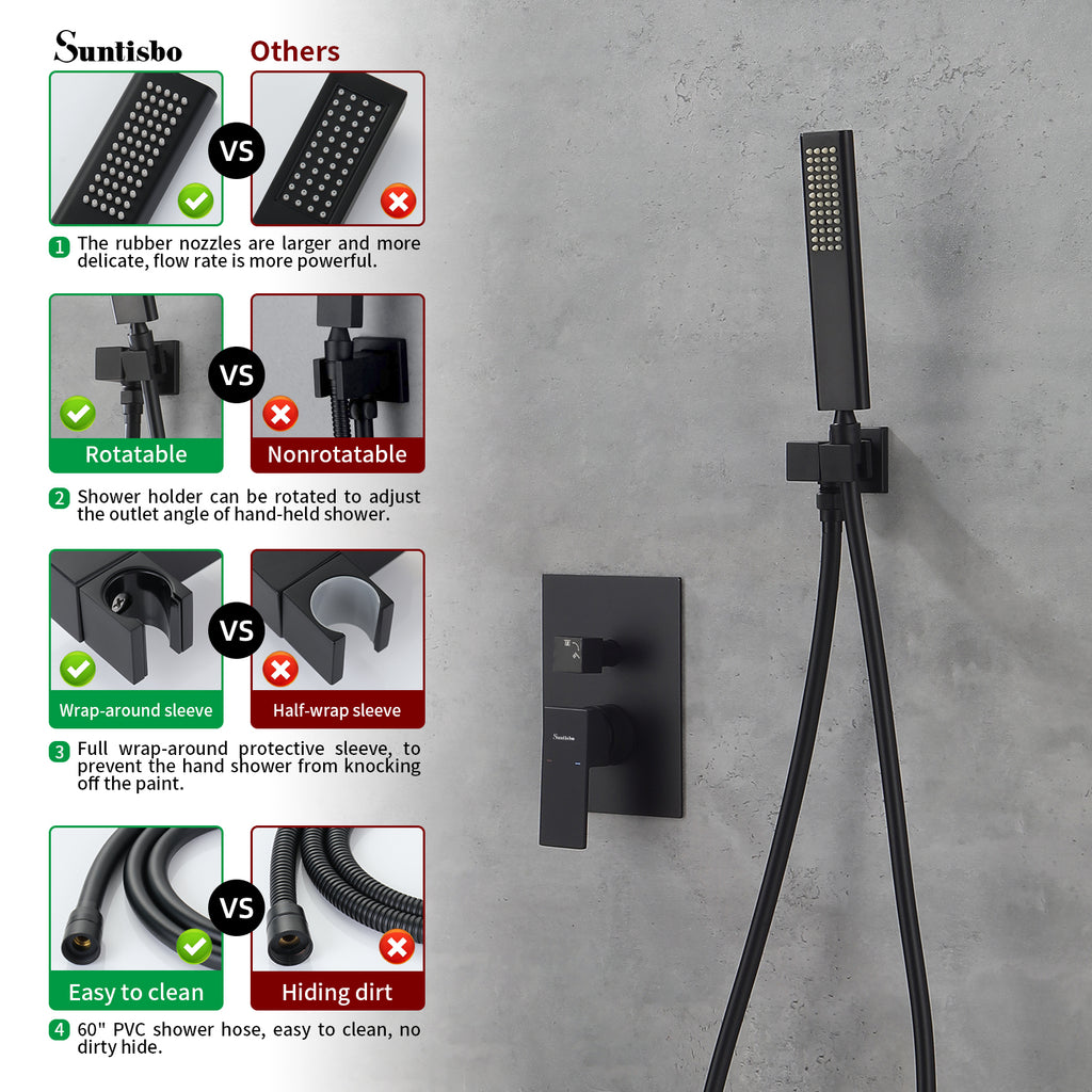 - ?Modern Black Shower System: Matte black shower head and trim kit is made of stainless steel, multi-layered electroplating surface passes the 48H Salt Spray Test, the corrosion-resistance help ensure durability in the humid environment of the shower room.