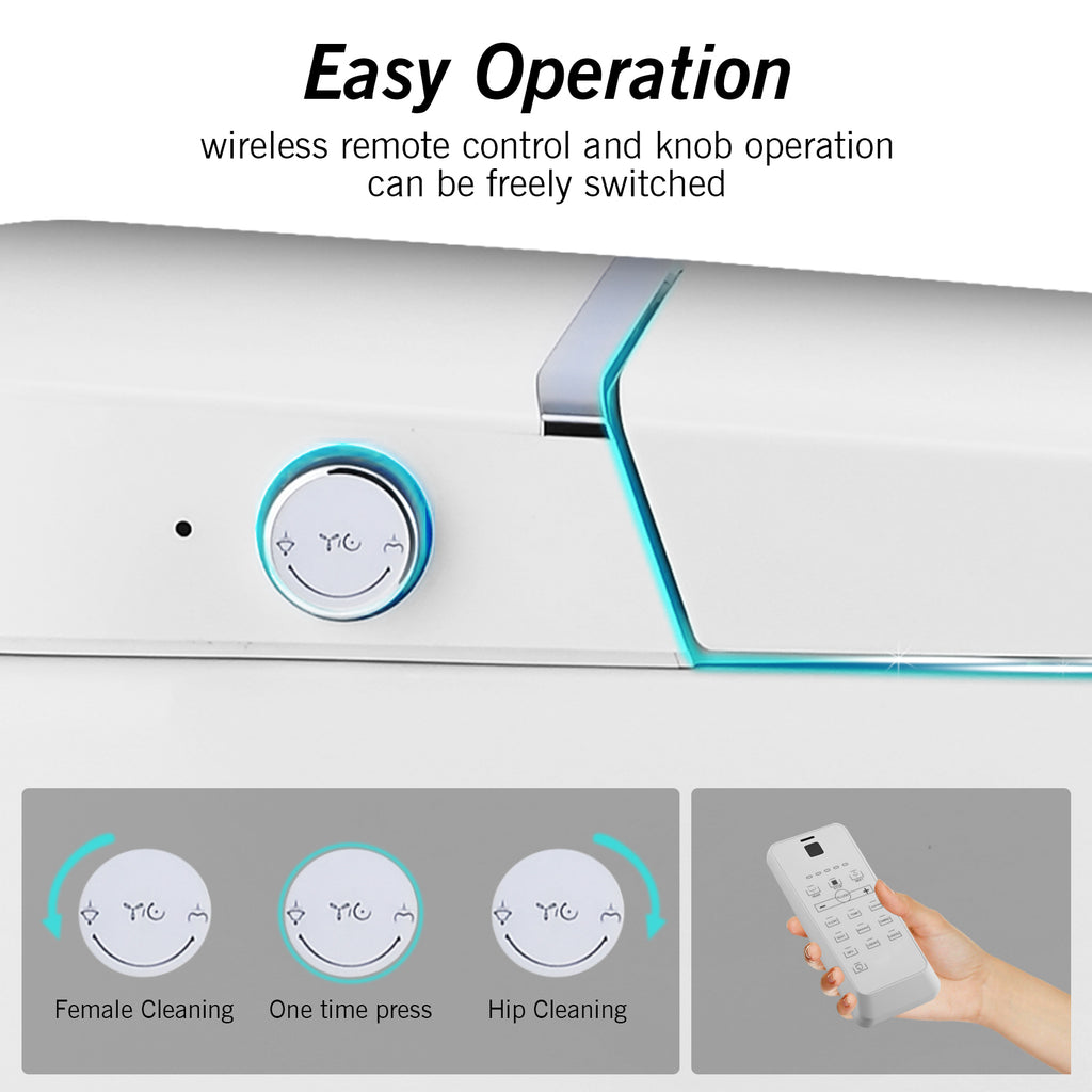 - The smart toilet has functions of off-seat flush, foot sensor flush, remote control flush and side knob flush, which completely frees your hands and makes it easy and comfortable.