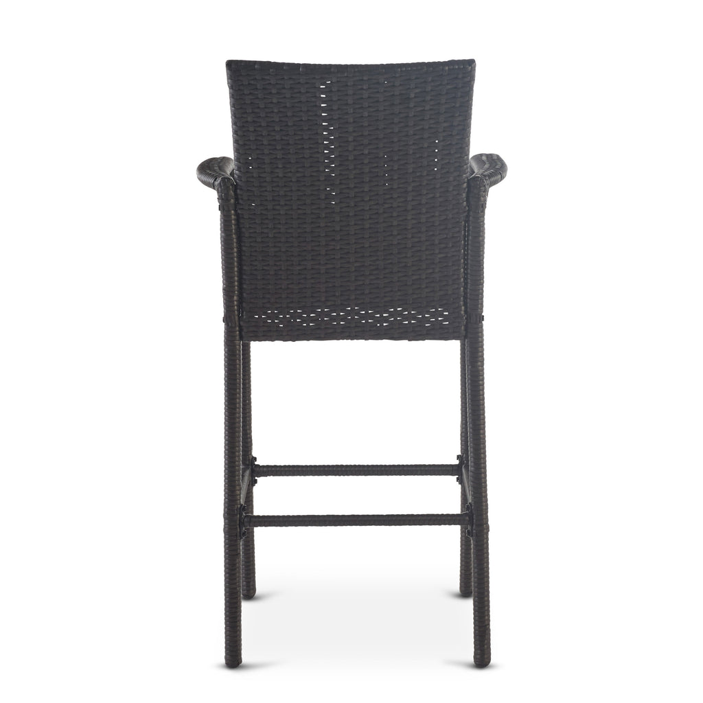 Entertain, dine, relax, and enjoy your patio with help from our gorgeous outdoor barstool set. Boasting durable construction and wicker-finished seating, these barstools are understated, versatile, and endlessly practical. These two chic, transitional barstools are easy to pair with modern and traditional furnishings alike. Pair these stools with an outdoor bar and serve cocktails in style, or go for a bar-height table to elevate your outdoor meals. Includes: Two (2) Barstools Material: Faux Rattan Frame Material: Iron Multiple Finish Options Assembly Required Dimensions: 24.80 inches deep x 24.35 inches wide x 46.50 inches high Seat Dimensions: 18.50 inches deep x 18.00 inches wide x 29.90 inches high Arm Height: 38.80 inches Weight Capacity: 400 lbs Country of Origin: China