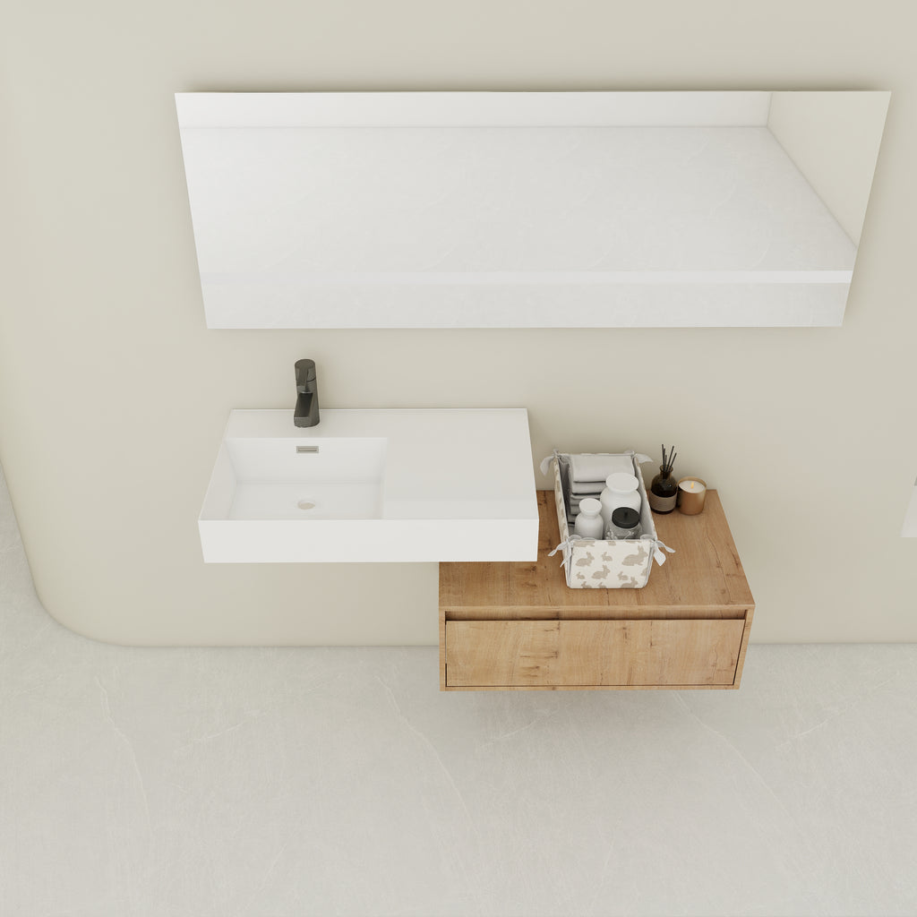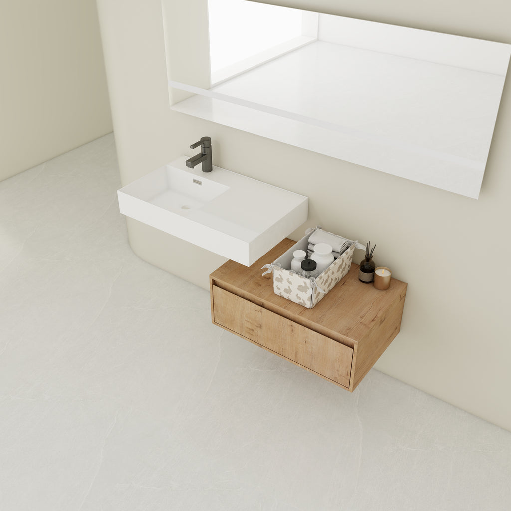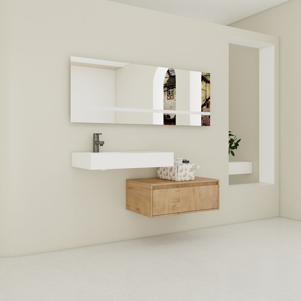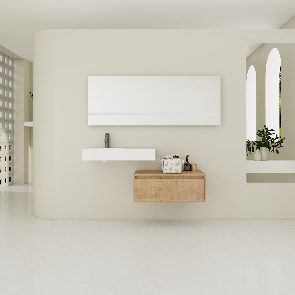 Our bathroom dresser adopts a wall-mounted design, perfectly blending modern minimalist style with natural beauty, adding a touch of freshness and elegance to your bathroom space. The main color is Imitative Oak, featuring a warm hue and natural texture that easily blends into modern home decors, showcasing taste and elegance.