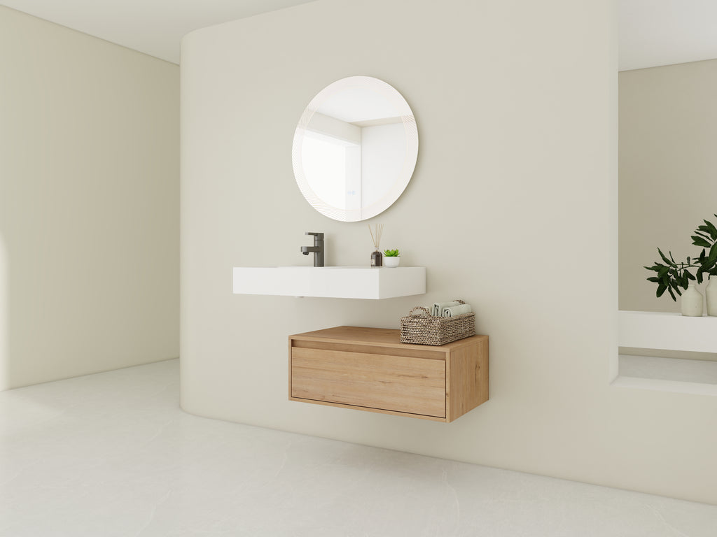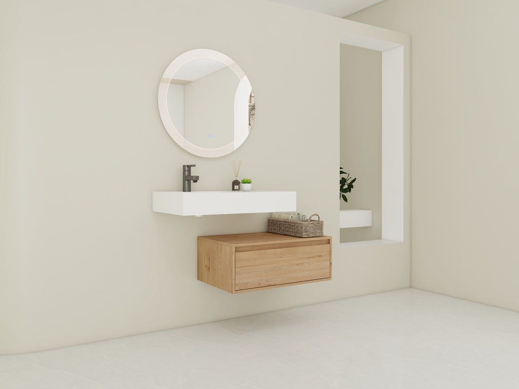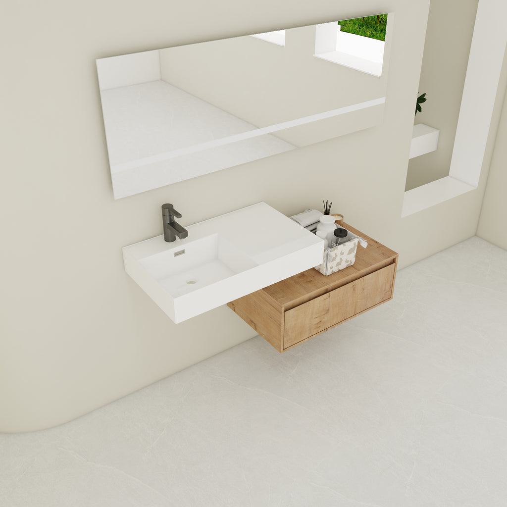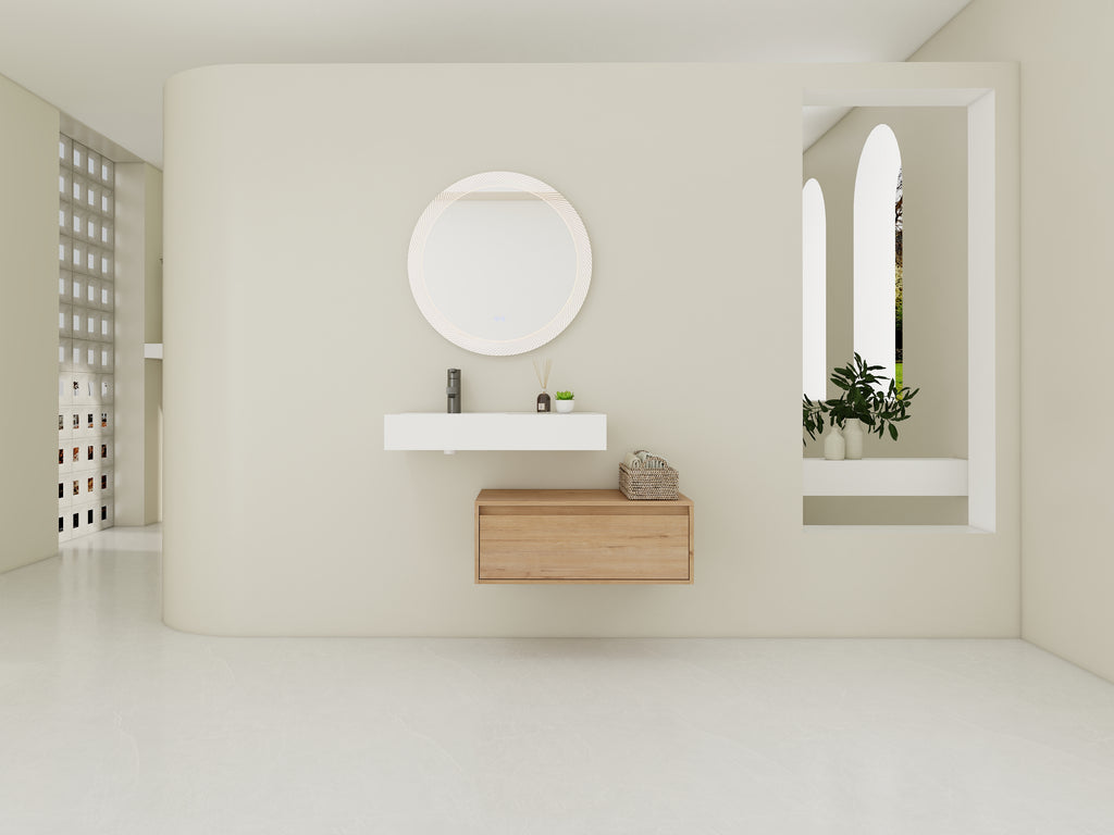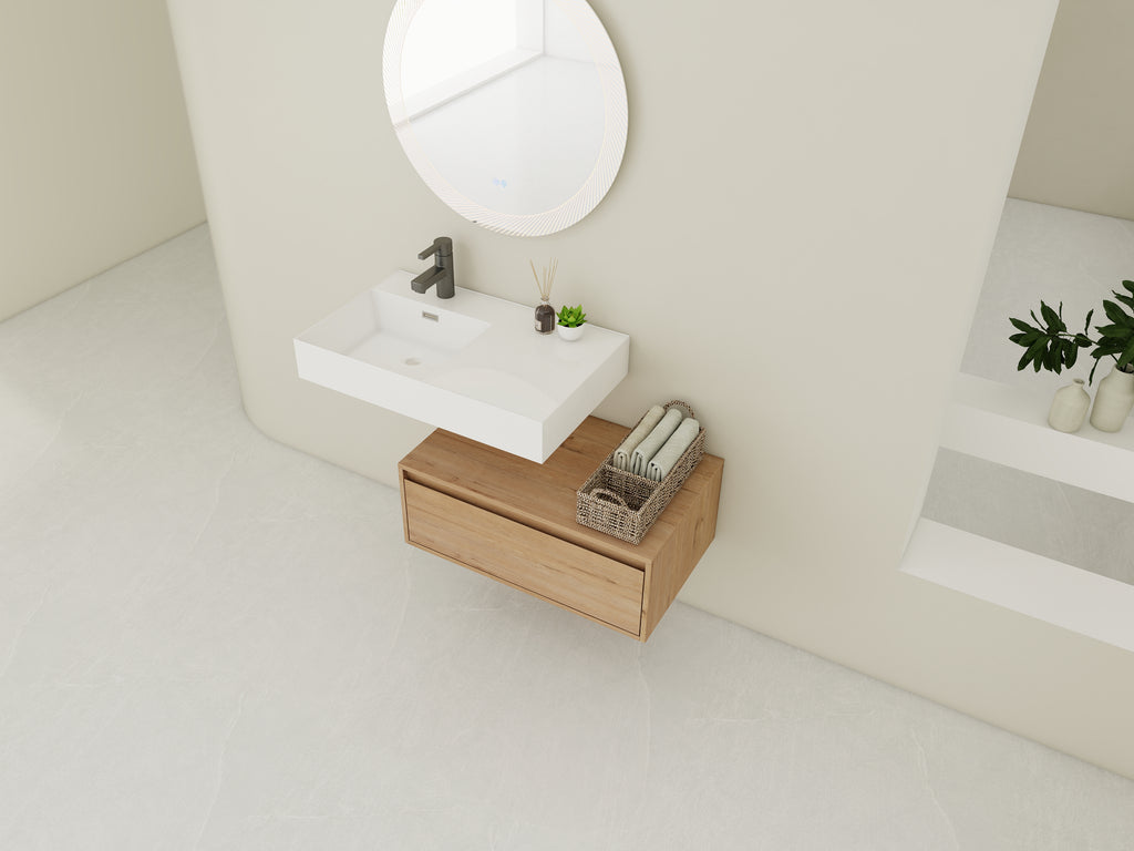 Our bathroom dresser adopts a wall-mounted design, perfectly blending modern minimalist style with natural beauty, adding a touch of freshness and elegance to your bathroom space. The main color is Imitative Oak, featuring a warm hue and natural texture that easily blends into modern home decors, showcasing taste and elegance.
