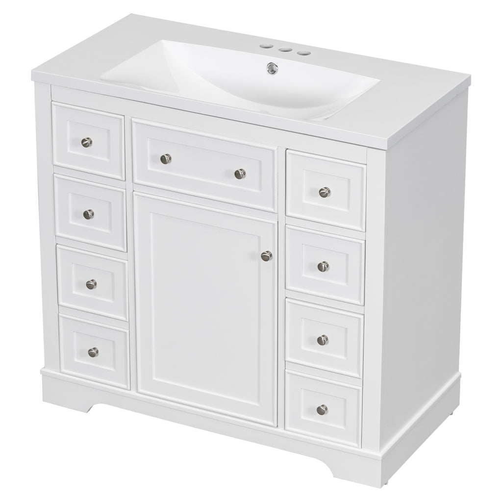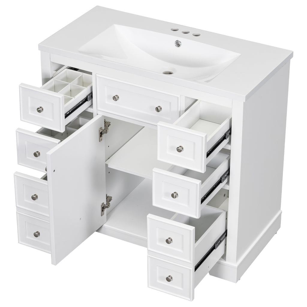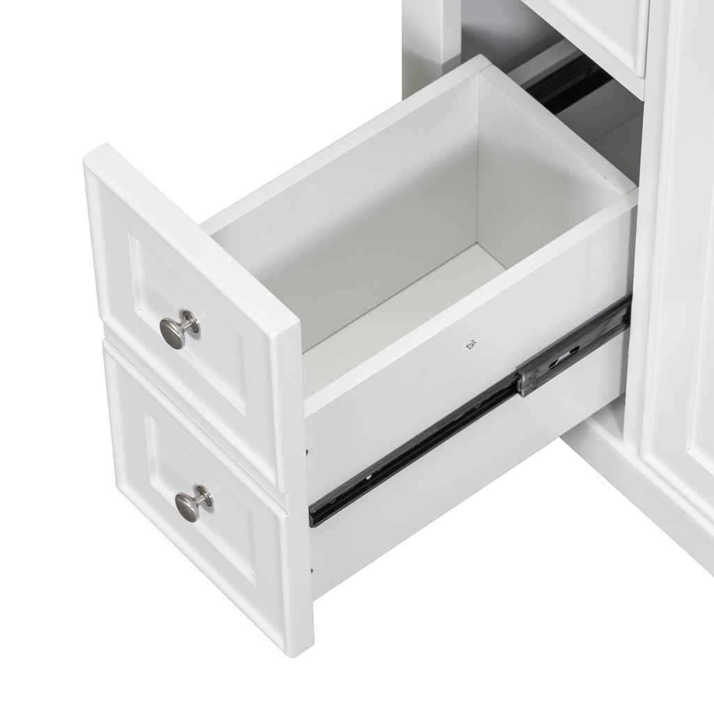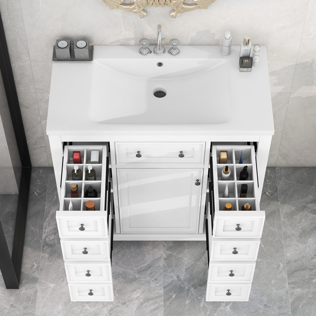 - Vanity with Cabinet & Drawers & Shelf - Considering the humid environment in bathroom, this bathroom vanity has ample enclosed storage spaces: one cabinet with door, three drawers with slide rail each side (the top middle one drawer is for decoration use only), and adjustable shelf in the cabinet. You can put soaps, towels, shampoos, tissue paper and other bathroom essentials in it so to keep them away from dust.