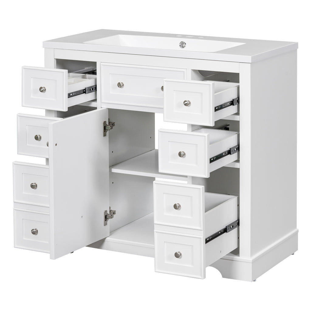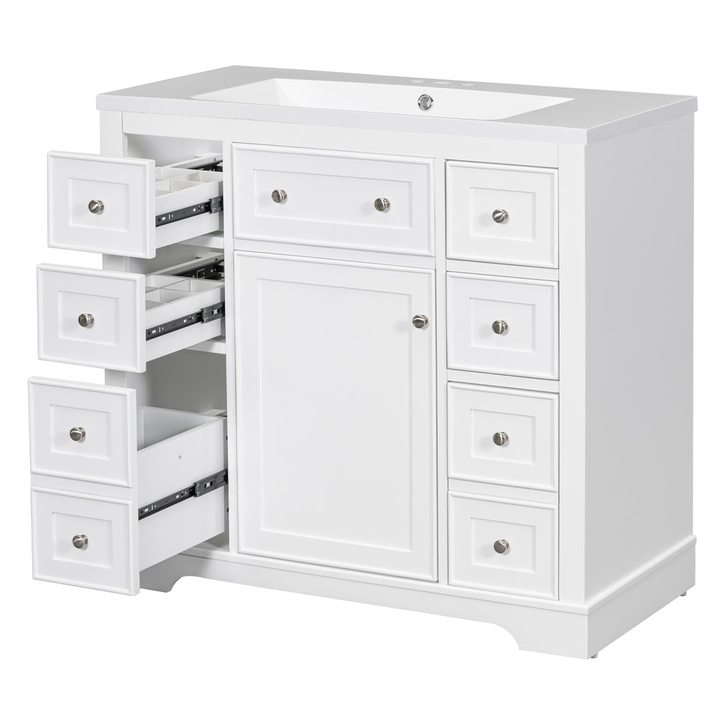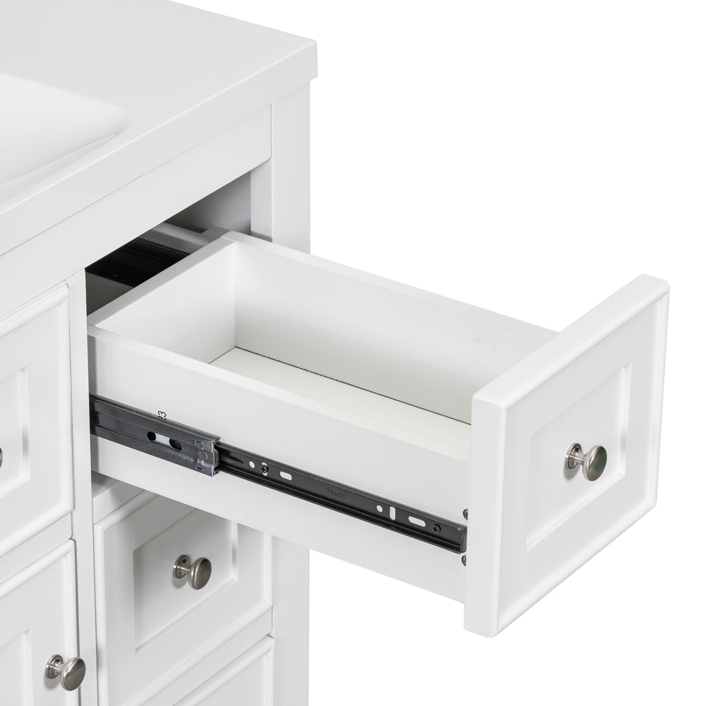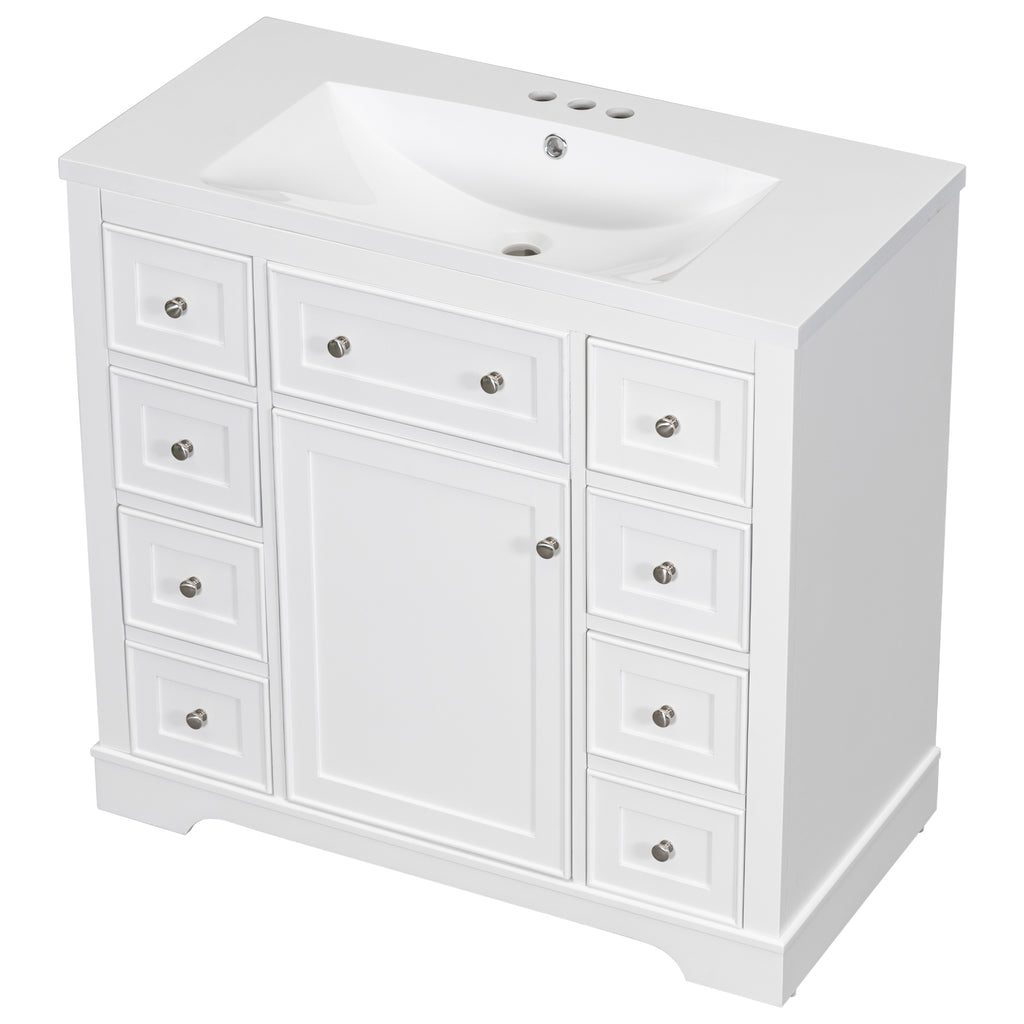 - Vanity with Cabinet & Drawers & Shelf - Considering the humid environment in bathroom, this bathroom vanity has ample enclosed storage spaces: one cabinet with door, three drawers with slide rail each side (the top middle one drawer is for decoration use only), and adjustable shelf in the cabinet. You can put soaps, towels, shampoos, tissue paper and other bathroom essentials in it so to keep them away from dust.