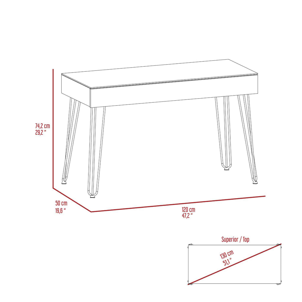 A gorgeous mahogany wood finish is paired with splayed metal legs to create an industrial vibe for this writing desk. One drawer adds storage for all your necessities and a glass desktop ensure surface protection and a modern finishing touch.