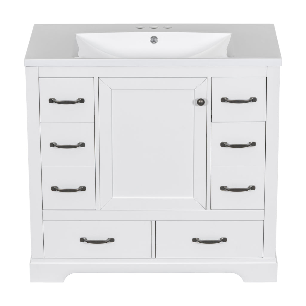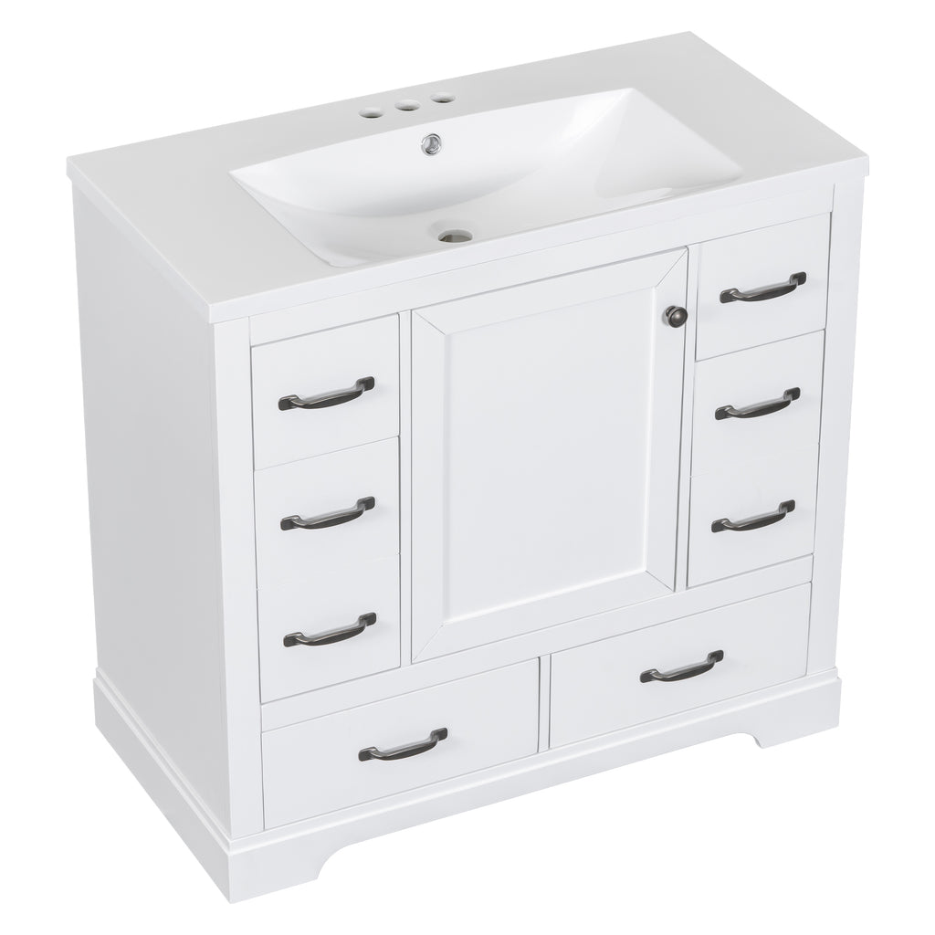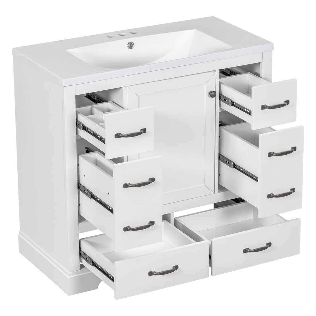 - Storage Space: This bathroom vanity has ample enclosed storage spaces: one cabinet with an adjustable shelf inside, and three drawers with slide rails each side. You can put soaps, towels, shampoos, tissue paper and other bathroom essentials in it so to keep them away from dust.
