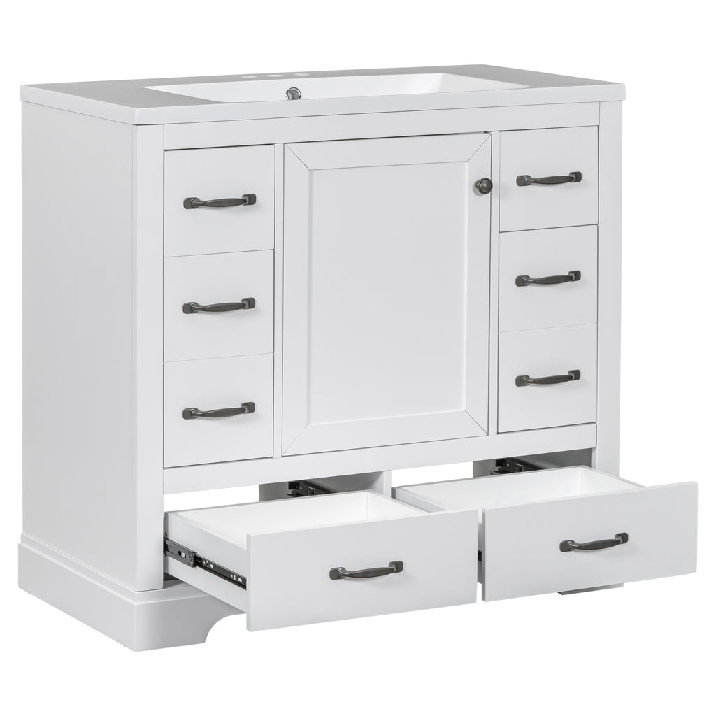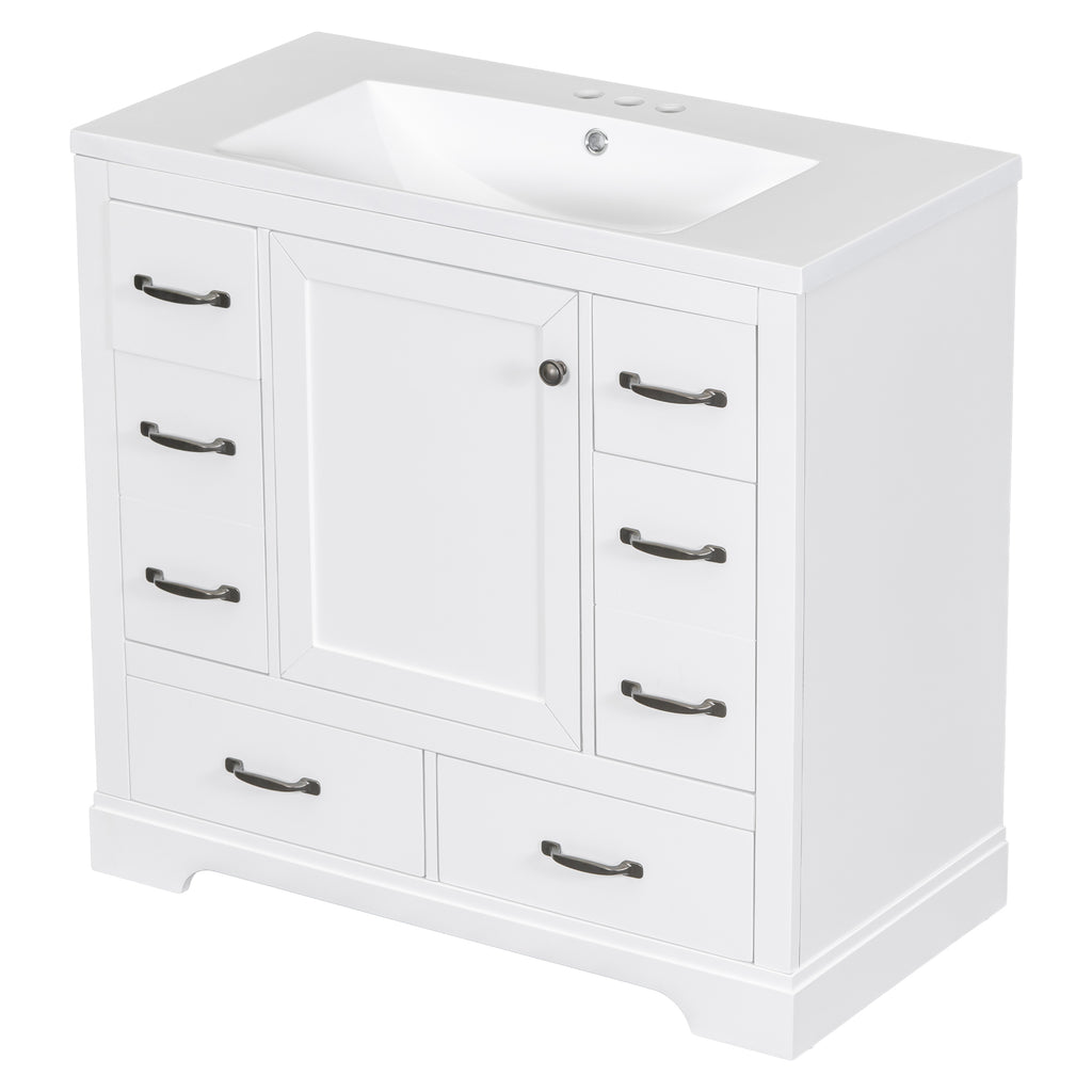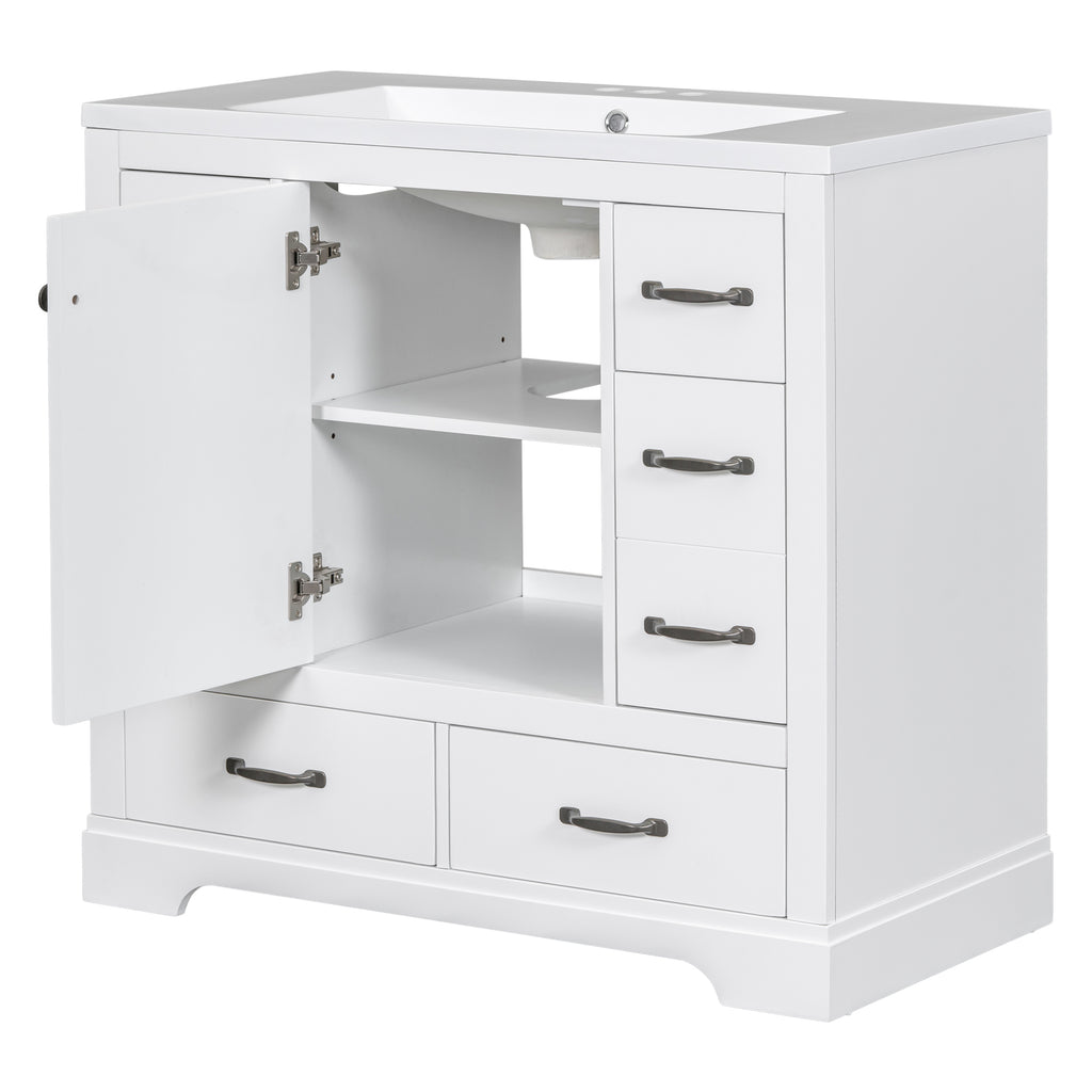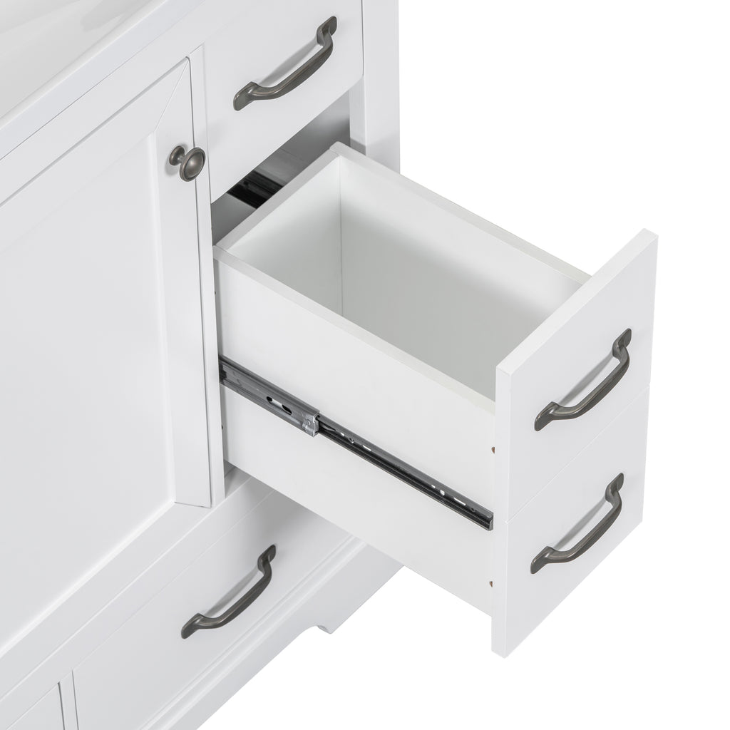 - Storage Space: This bathroom vanity has ample enclosed storage spaces: one cabinet with an adjustable shelf inside, and three drawers with slide rails each side. You can put soaps, towels, shampoos, tissue paper and other bathroom essentials in it so to keep them away from dust.