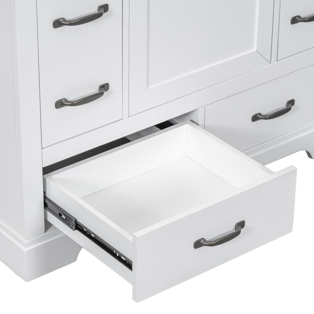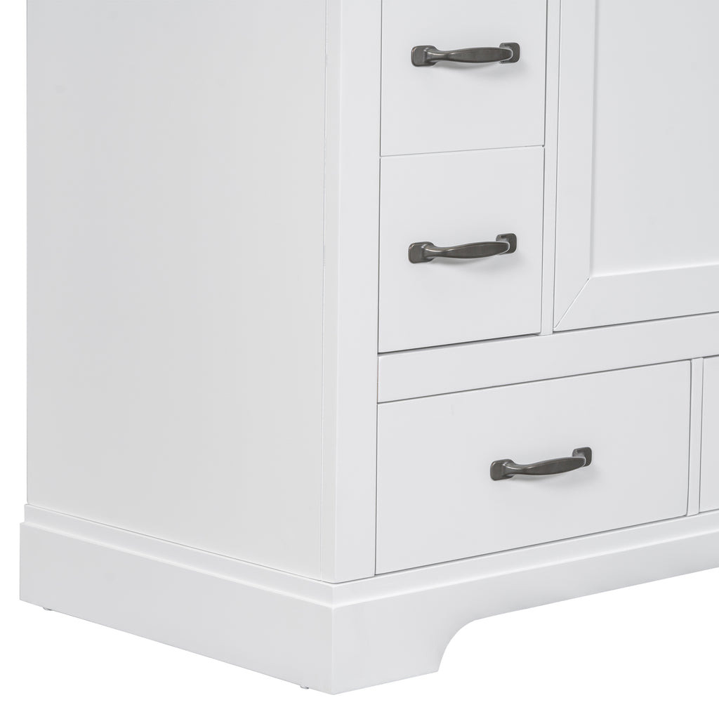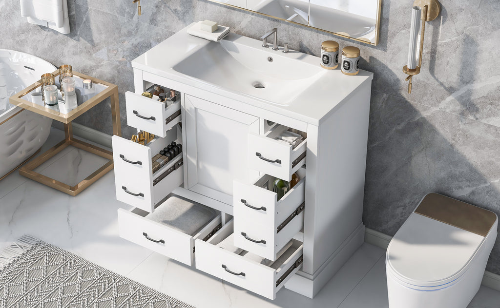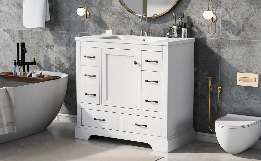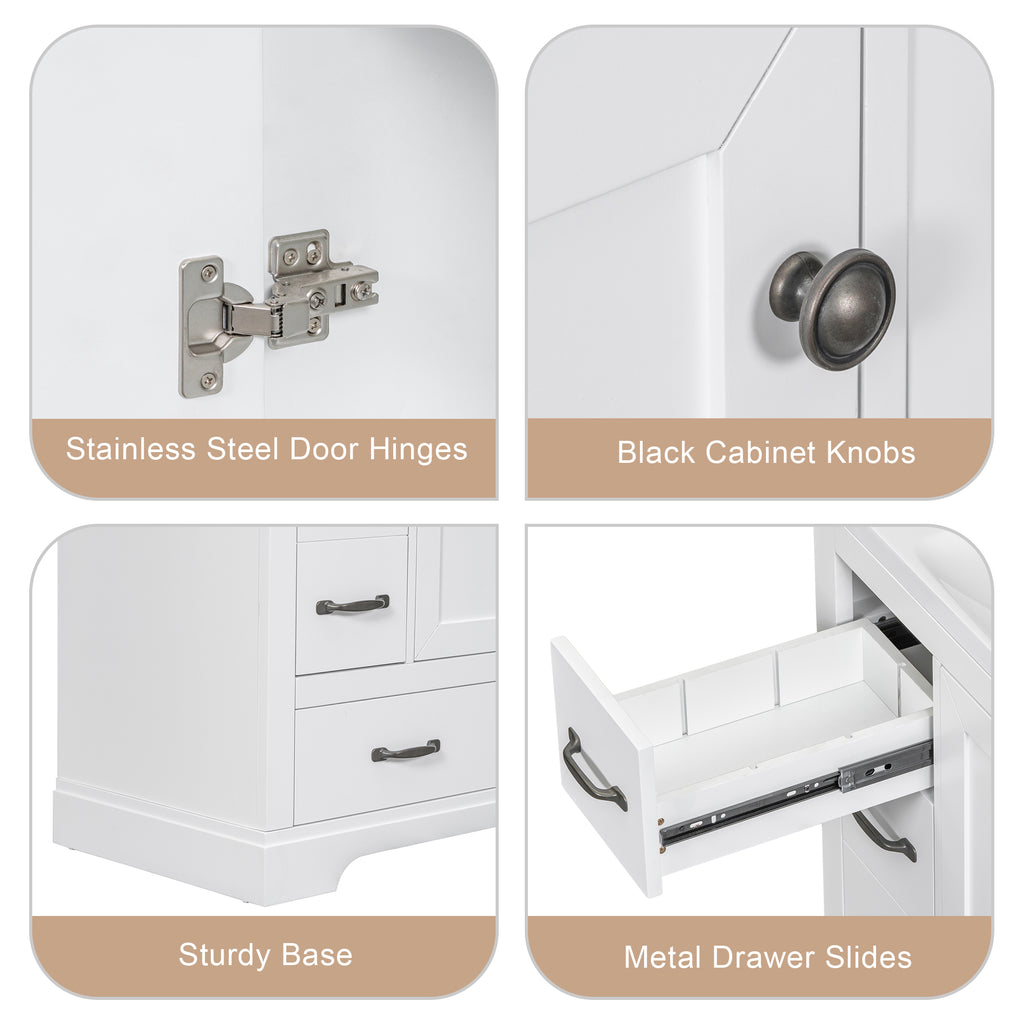 - Two Packages & Assembly: This bathroom vanity needs assembly. All the hardware(screws, metal door hinges and handles, drawer slides, anti-toppling device etc.) and instruction manual are provided. You can install it according to the instruction easily.