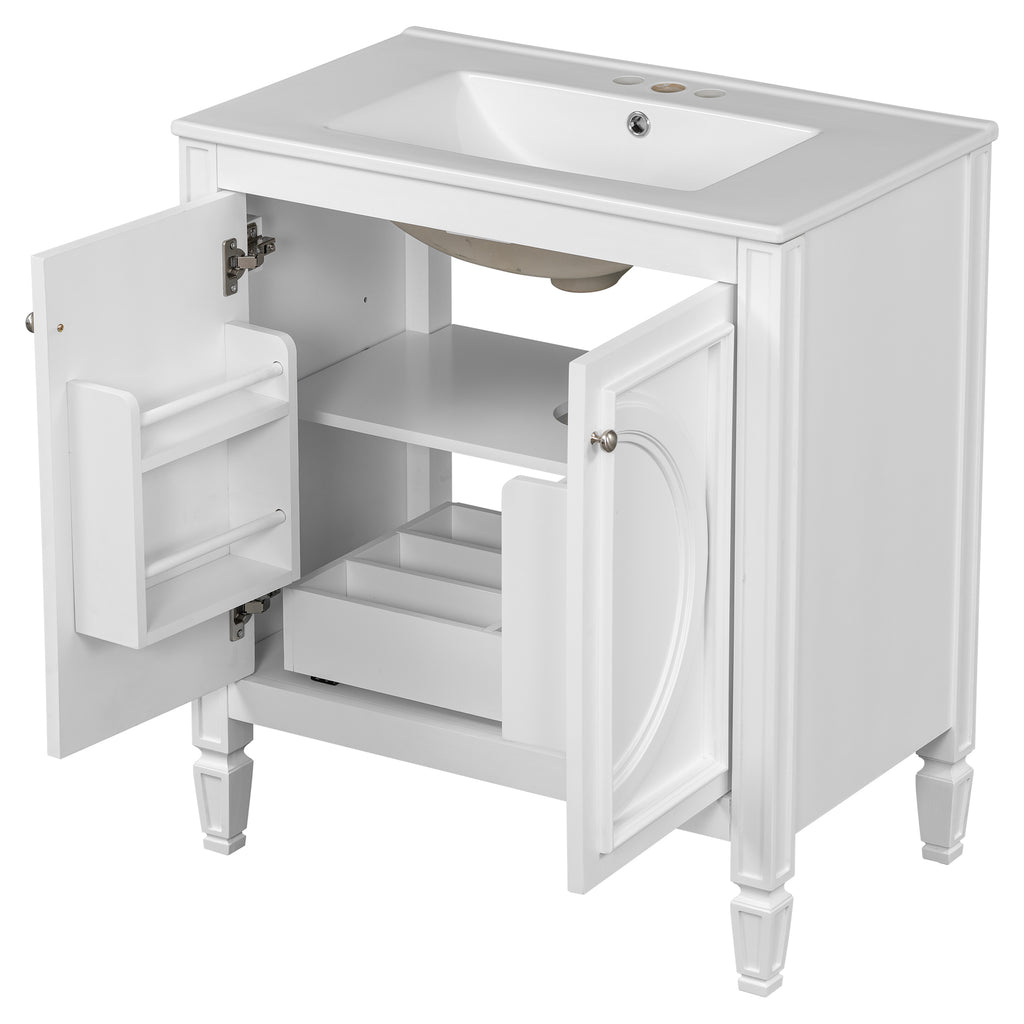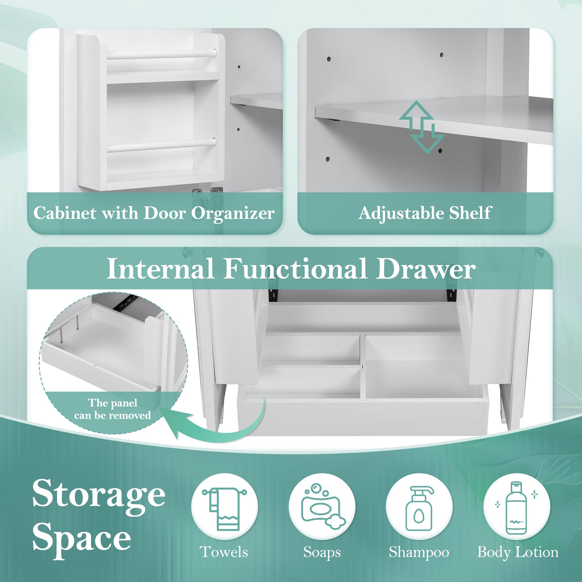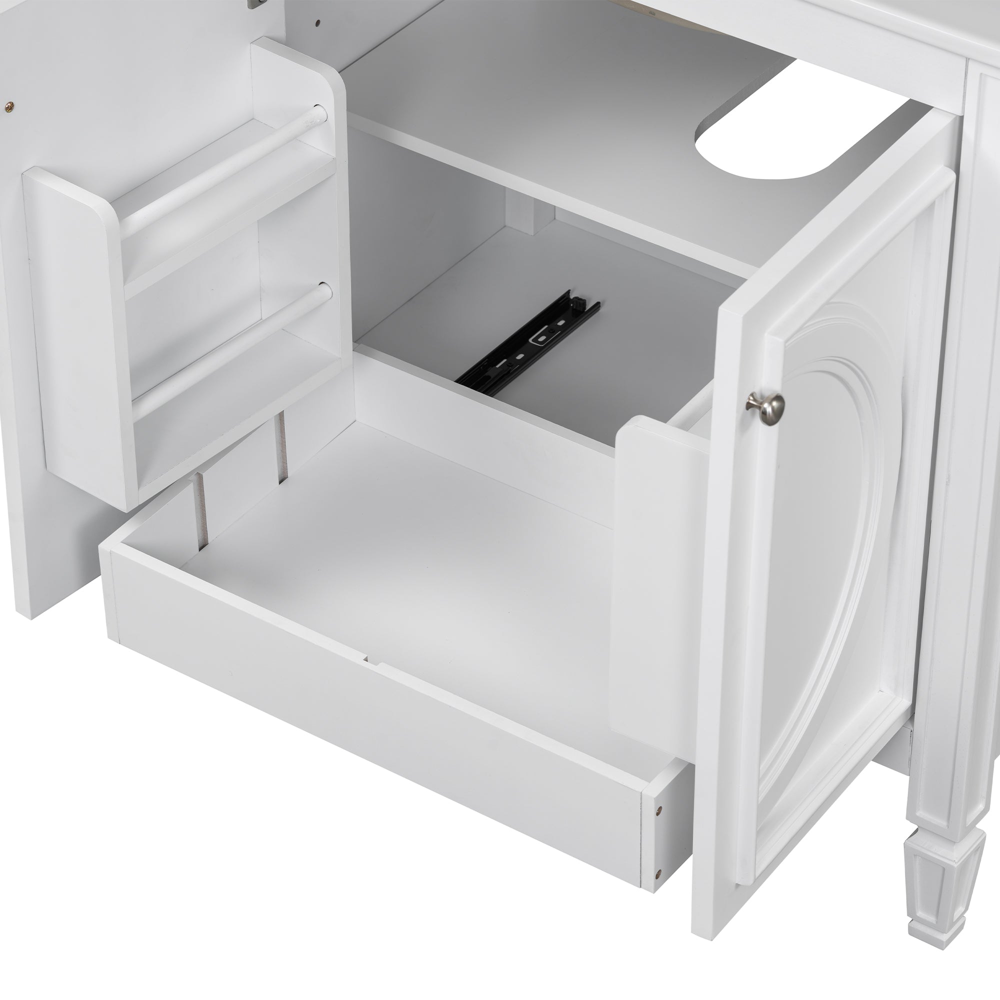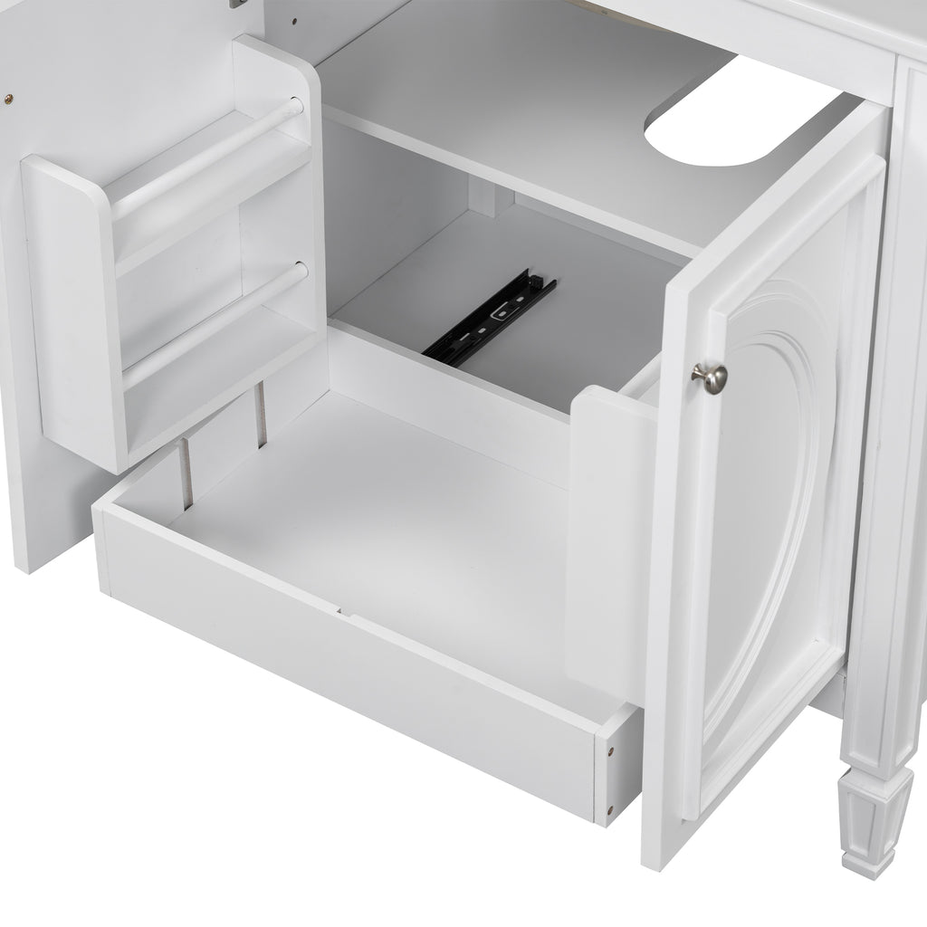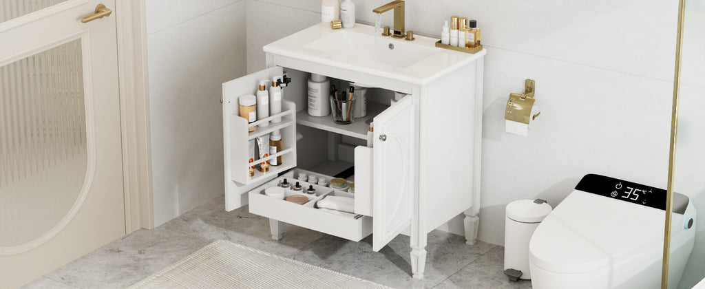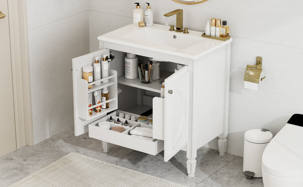 - Storage Space: This bathroom vanity has ample storage space: two doors with two-tier storage shelf, one drawer and an adjustable shelf. You can put soaps, towels, shampoos, tissue paper and other bathroom essentials in it so to keep them away from dust. Especially, the panel in the drawer is removable so you can create this space into diffferent parts according to your storage needs.