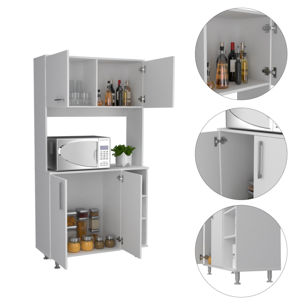 - Pantry cabinet features two double-door cabinets, one upper and one lower cabinet. The doors are made of sturdy manufactured wood and have a beautiful finish that will complement any kitchen.