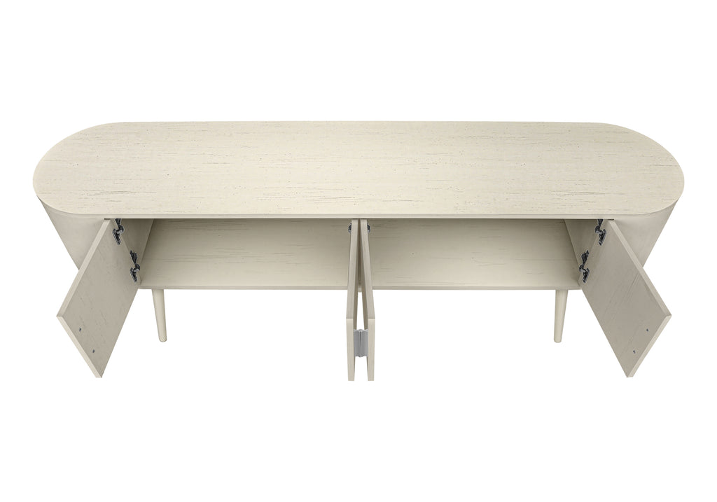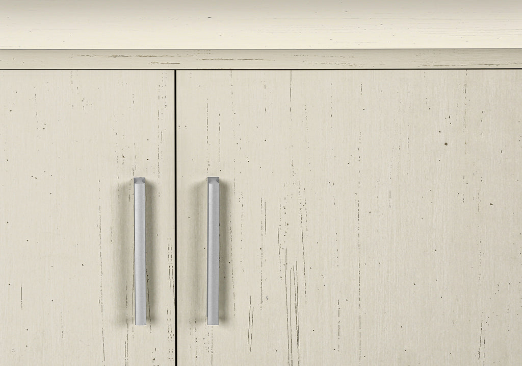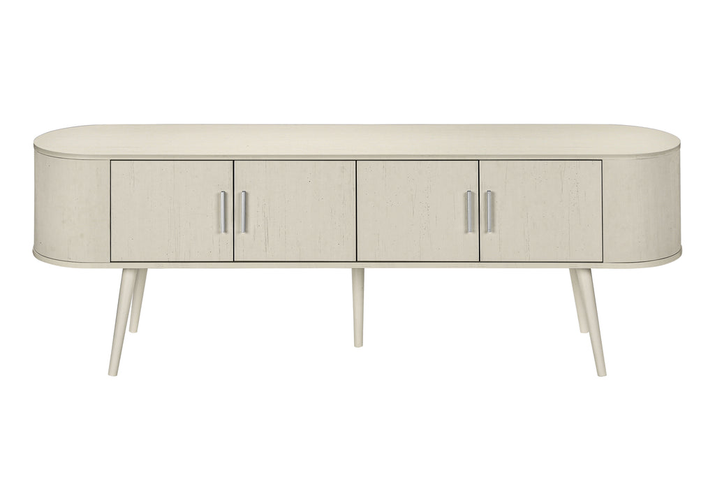 - Durably designed with antique white solid wood legs, this console offers spacious storage cabinets and 2 hidden cable management holes for organizing your media entertainment center.