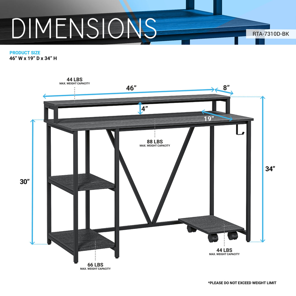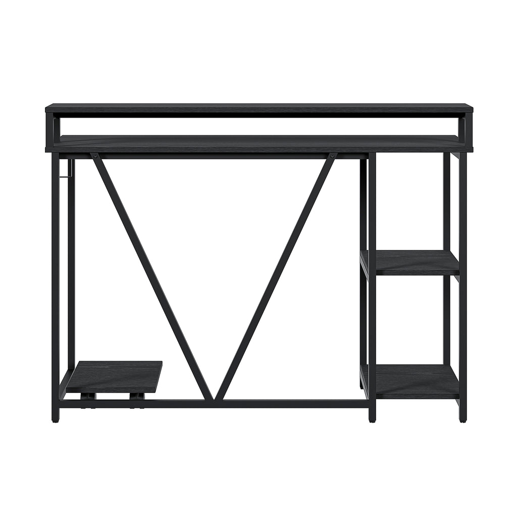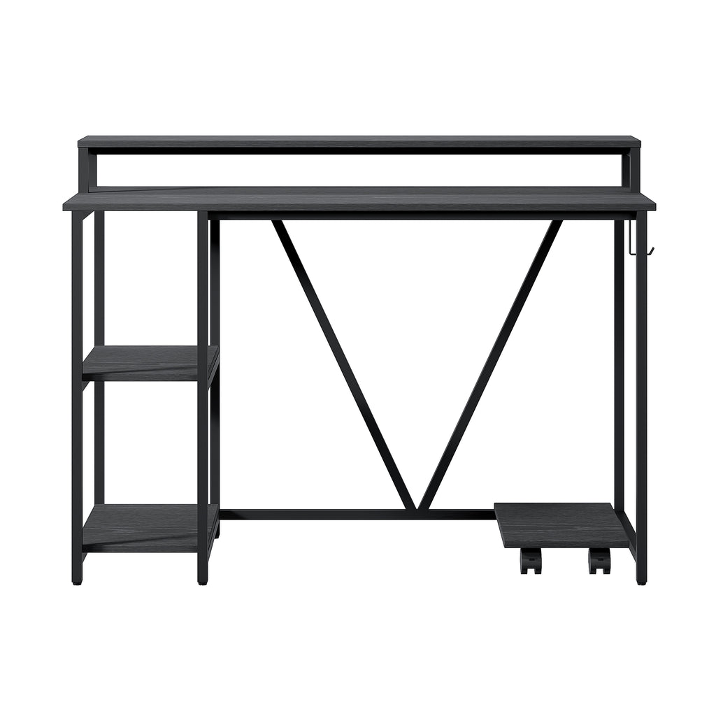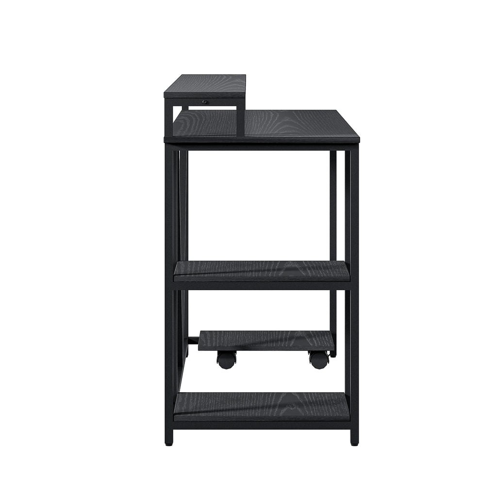 This writing desk features a clean-lined silhouette with a two-tier side open shelf plus an elevated hutch-like shelf giving your home office a modern industrial look. The engineered wood surfaces showcase a rich black wood grain hue with sturdy steel frame that brings some industrial vibes to your workspace. It includes a powder-coated steel frame adding plenty of support, plus a small side holder hook to hang your headphones , or any other accessories. It also includes a convenient mobile CPU Caddy to elevate your CPU box off the floor.