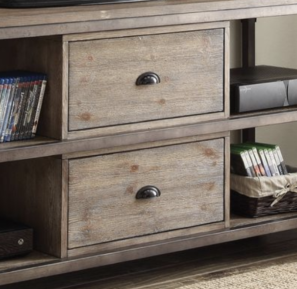 - KD, Rectangular TV Stand w/2 Drawer & 4 Media Compartments (Open Storage Rack/No Drawers), Wooden Top/Shelves/Drawer: Weathered Oak finish (No Apron), Metal Leg & Frame: Antique Silver (NO Caster leg)•Drawer: Side Metal (Ball Bearing/ Full Ext), DT Included