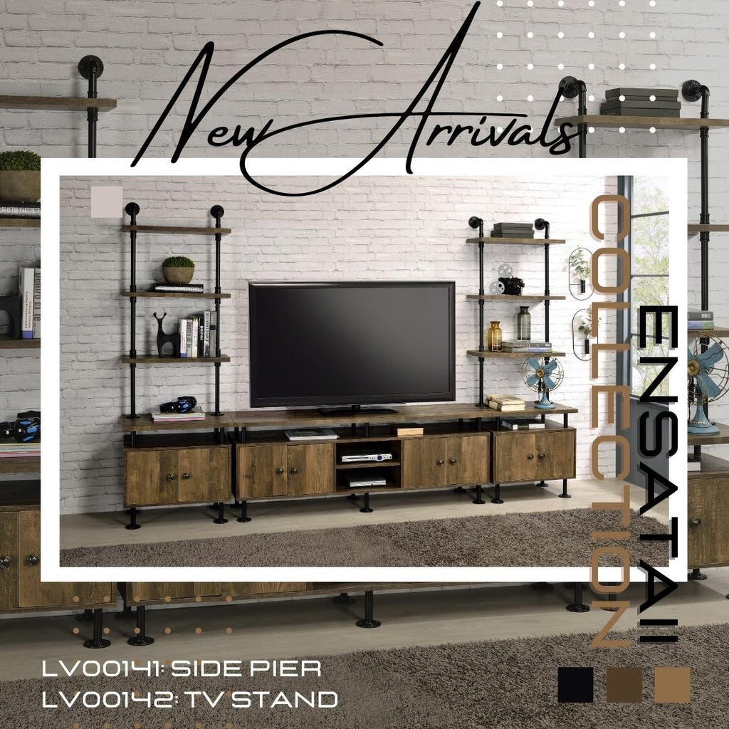 This versatile piece offers four open compartments for displaying media devices or decorative items, along with four doors for concealed storage of media accessories or other items, ensuring practicality and organization in any living space. Its distinctive water pipe style design incorporates rustic metal elements, lending an industrial charm and unique aesthetic appeal, while providing a stable and secure platform for up to a 60-inch flat-screen TV with integrated cord management features for neat and organized routing of cables and wires, maintaining a clean and clutter-free appearance around entertainment systems.