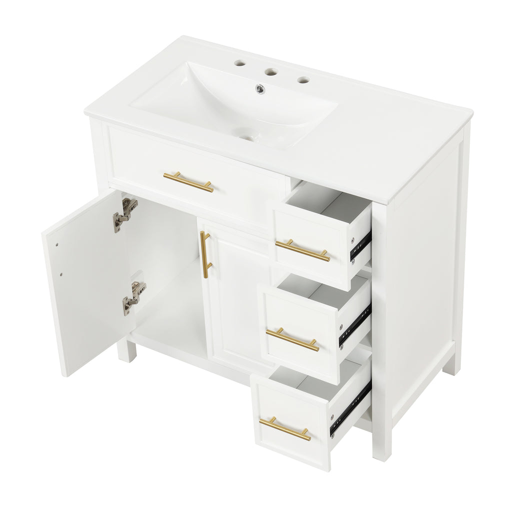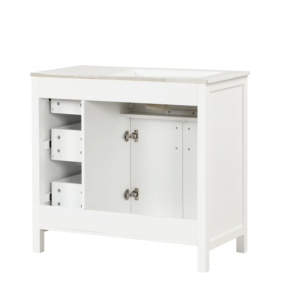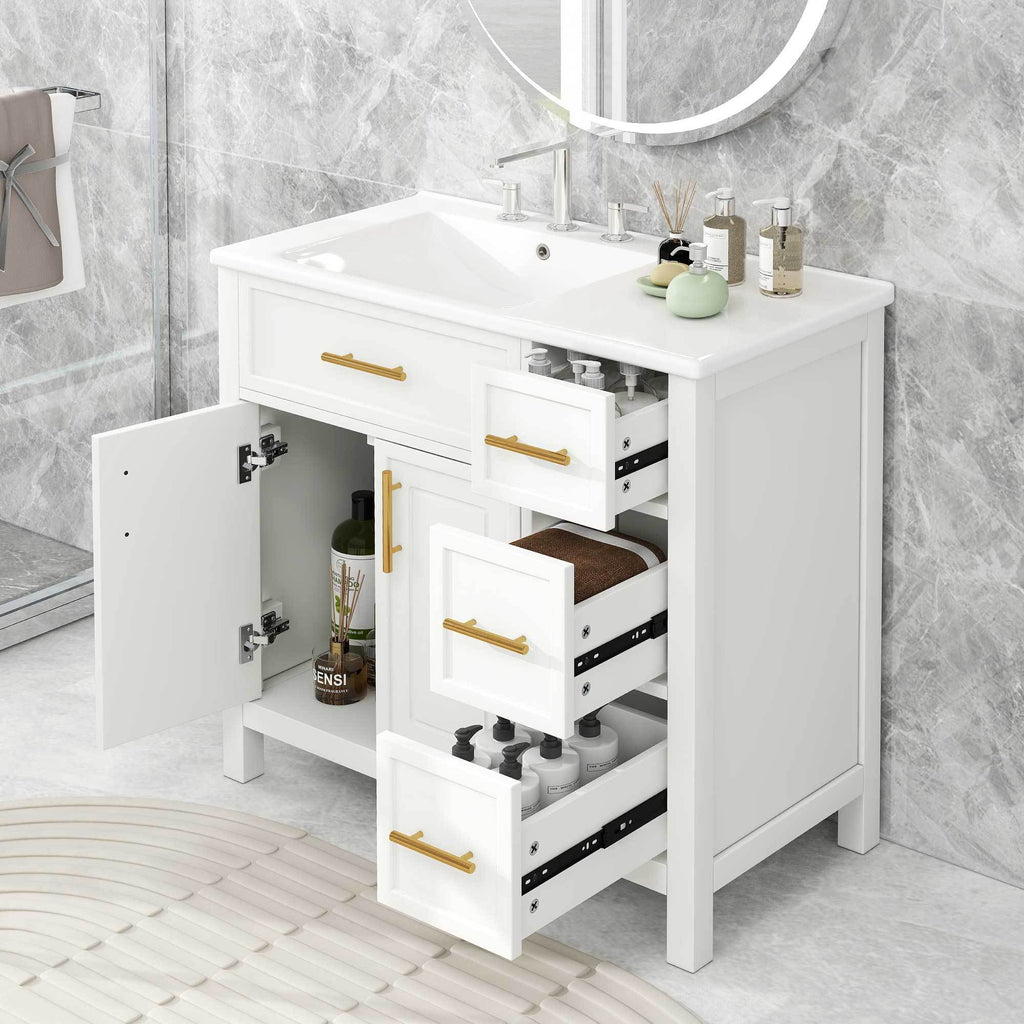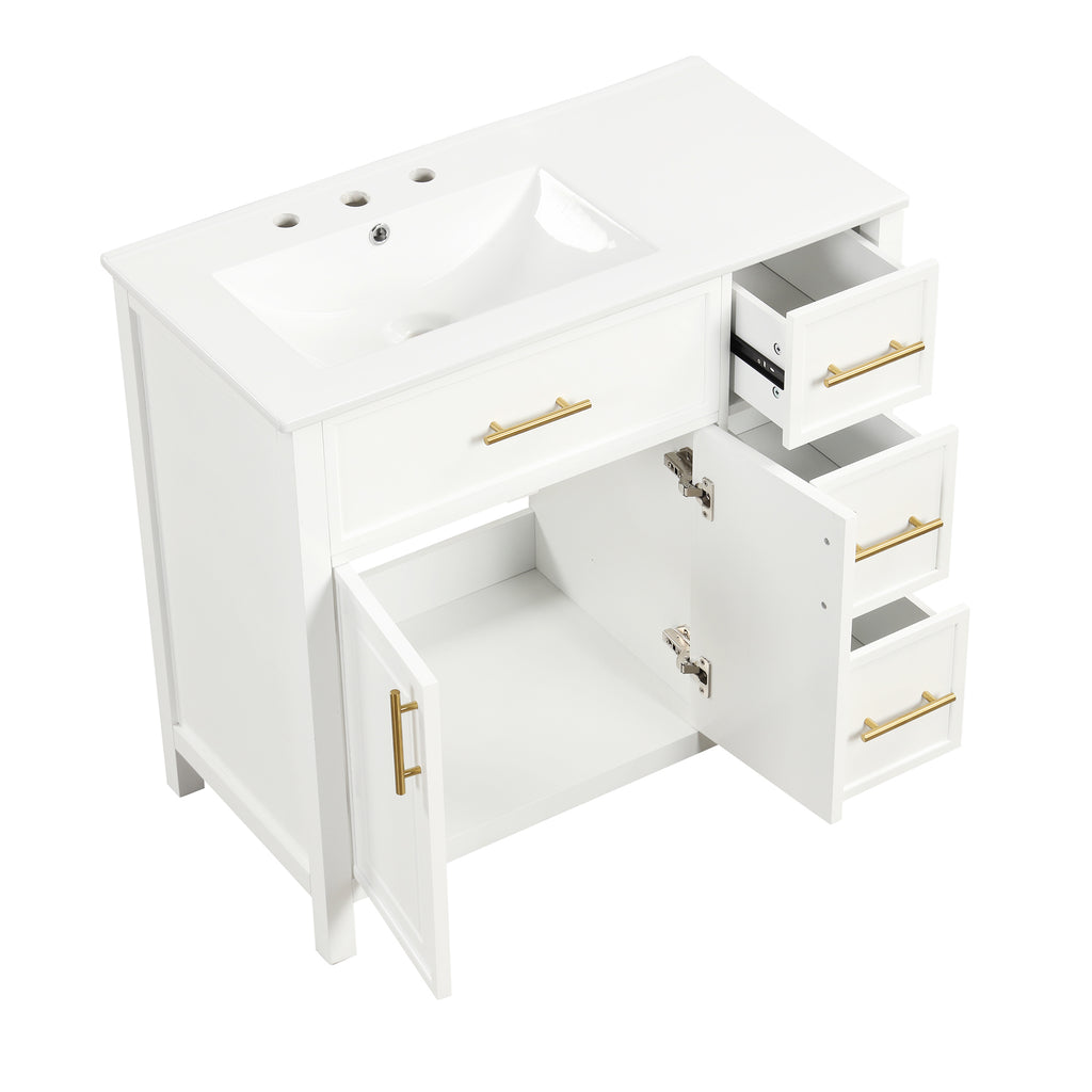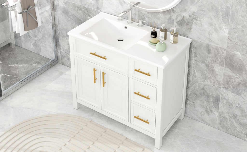 - Vanity with Cabinet & Drawers: Considering the humid environment in bathroom, this bathroom vanity has ample enclosed storage spaces: one cabinet with two doors and three drawers with slide rails. You can put soaps, towels, shampoos, tissue paper and other bathroom essentials in it so to keep them away from dust.